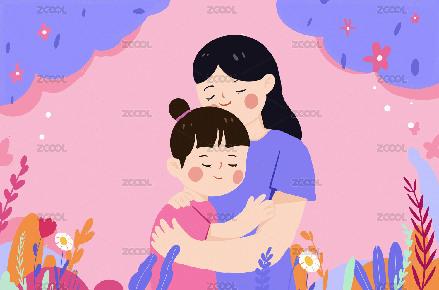 拥抱在一起的母女小清新插画