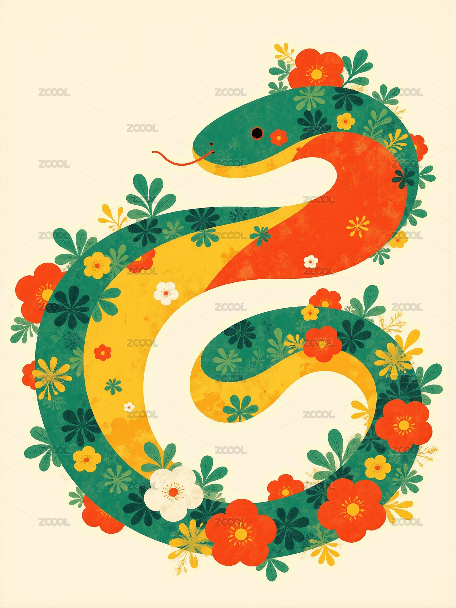 喜庆的复古风格五彩斑斓的蛇和花朵