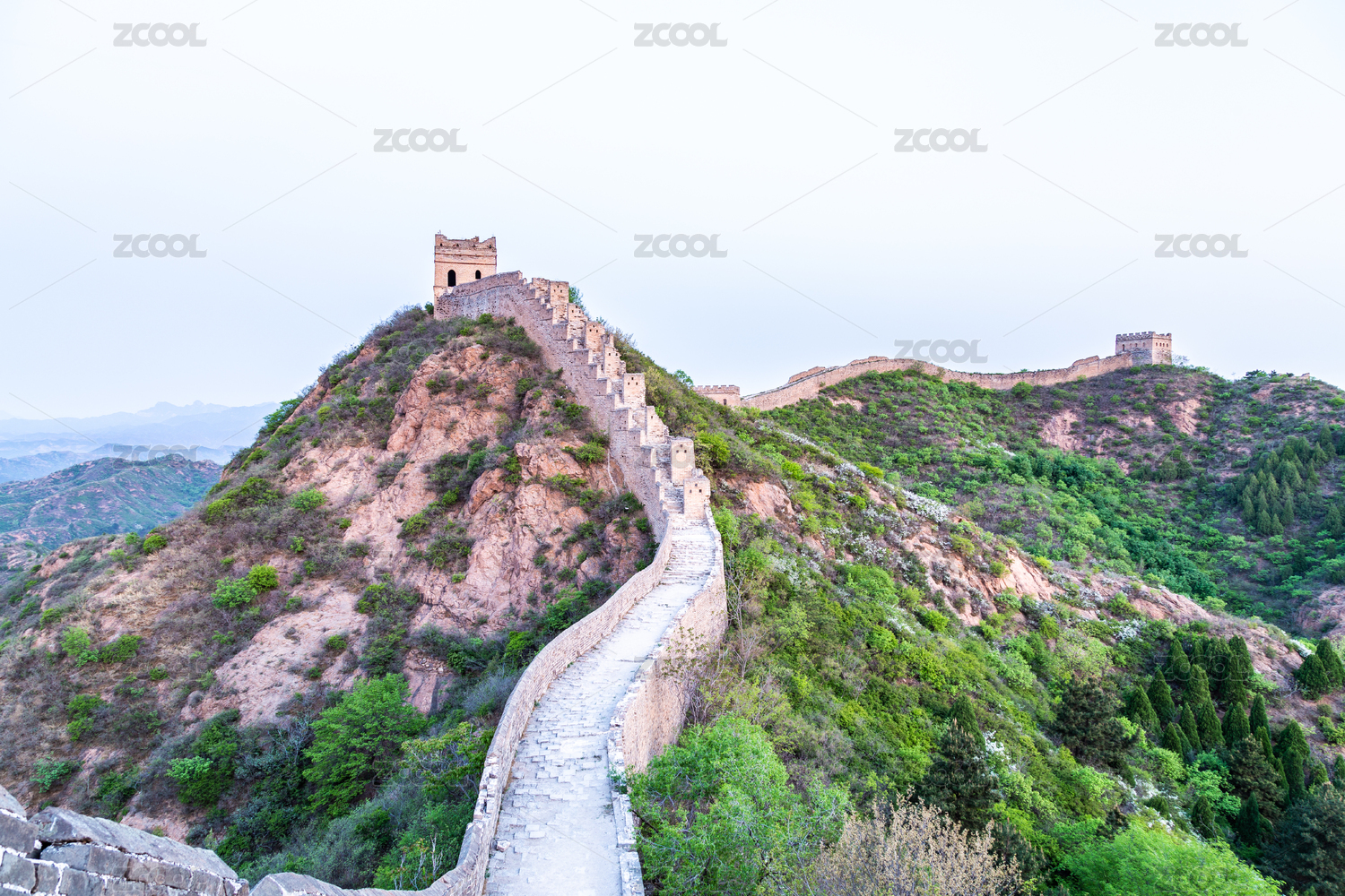 蓝天白云下的中国长城蜿蜒盘旋丛山峻岭
