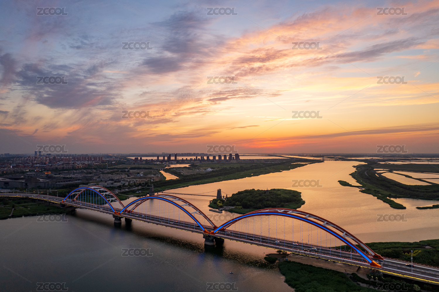 日落晚霞天津滨海新区生态城永定新河彩虹桥