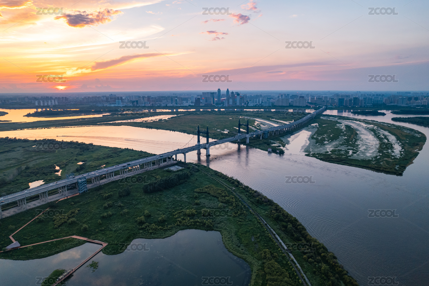 航拍黑龙江省大庆市龙凤湿地大桥