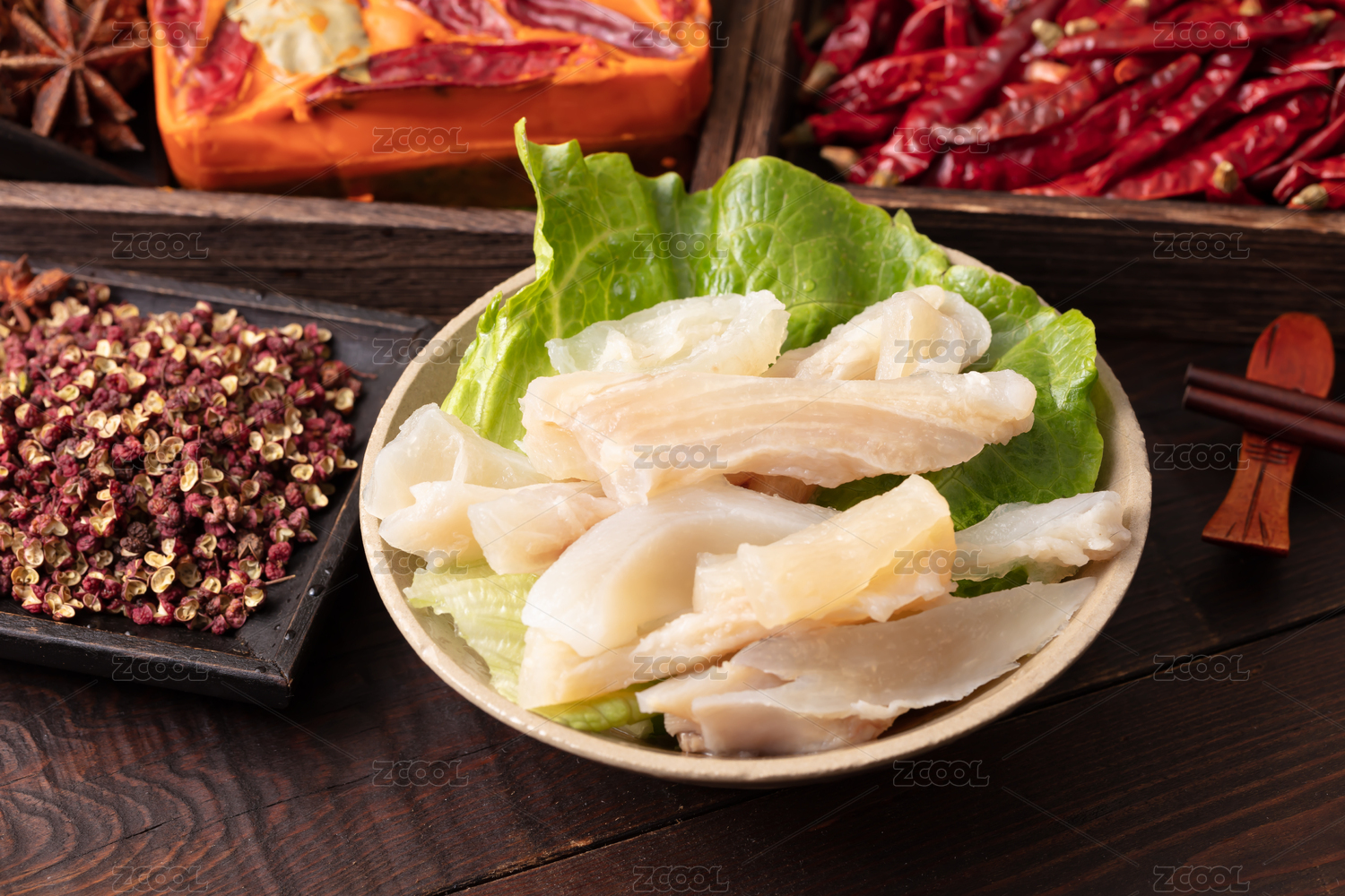 木盘上粗碗里的重庆老火锅菜品猪牙梗