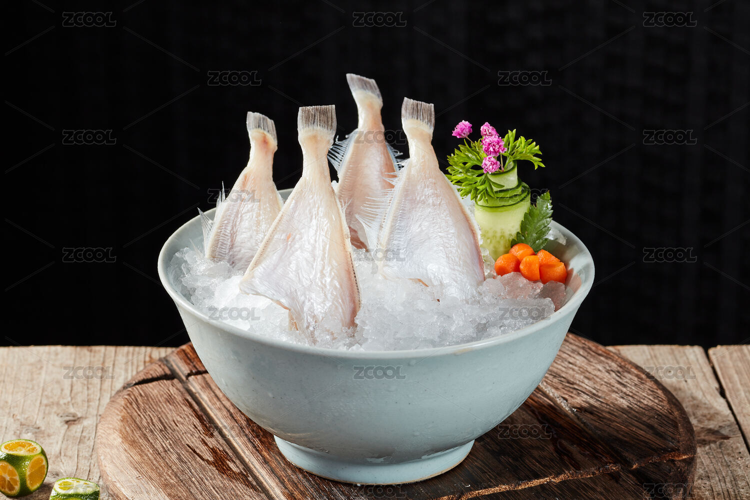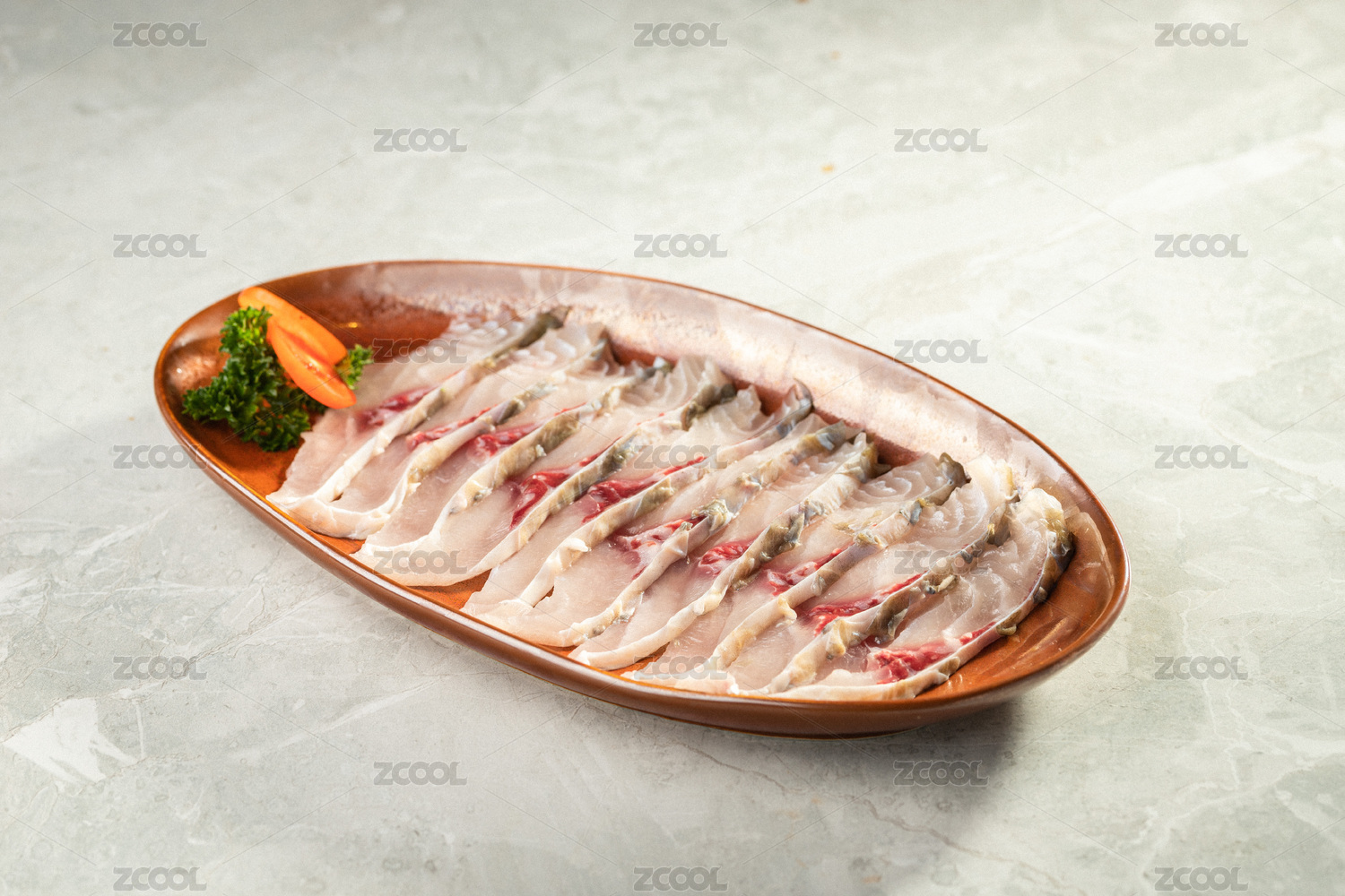 白盘里的重庆老火锅菜品冰鲜大耗儿鱼