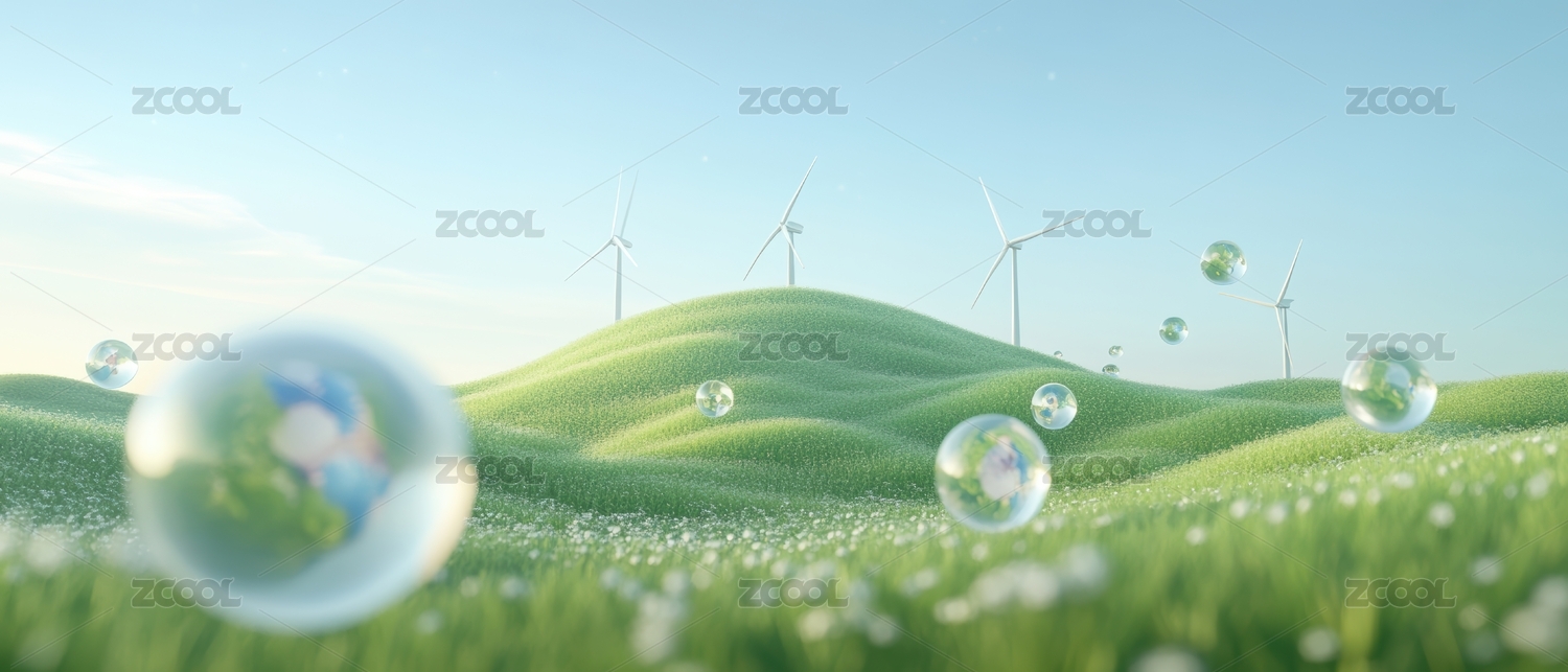 夏天白天绿色山顶的风力发电机3D卡通插画