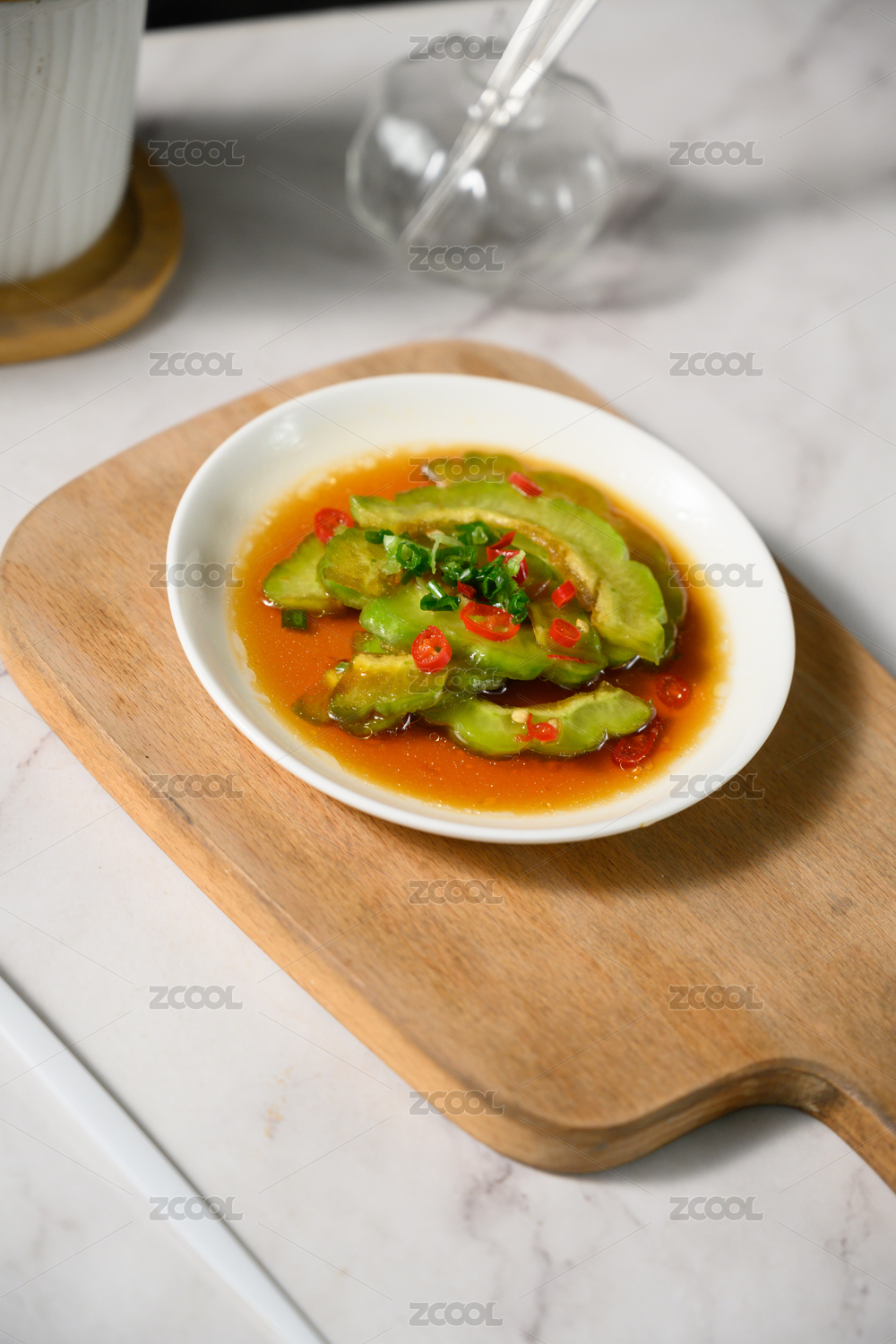 桌面上的盘子里的美味可口的凉拌苦瓜