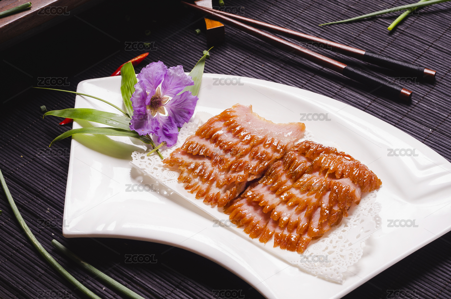 米花色瓷盘装的蜜汁叉烧肉摆放在樟木砧板上
