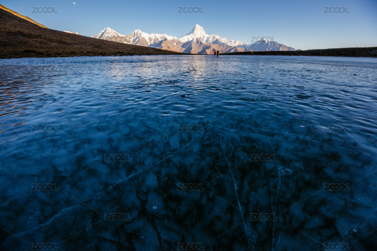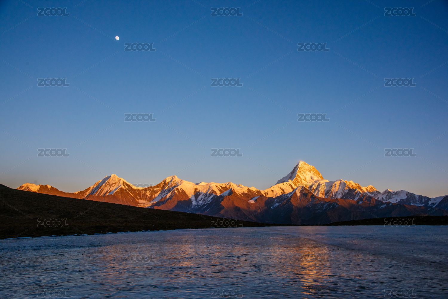 积雪覆盖的中国贡嘎雪山,与结冰的蓝色湖面