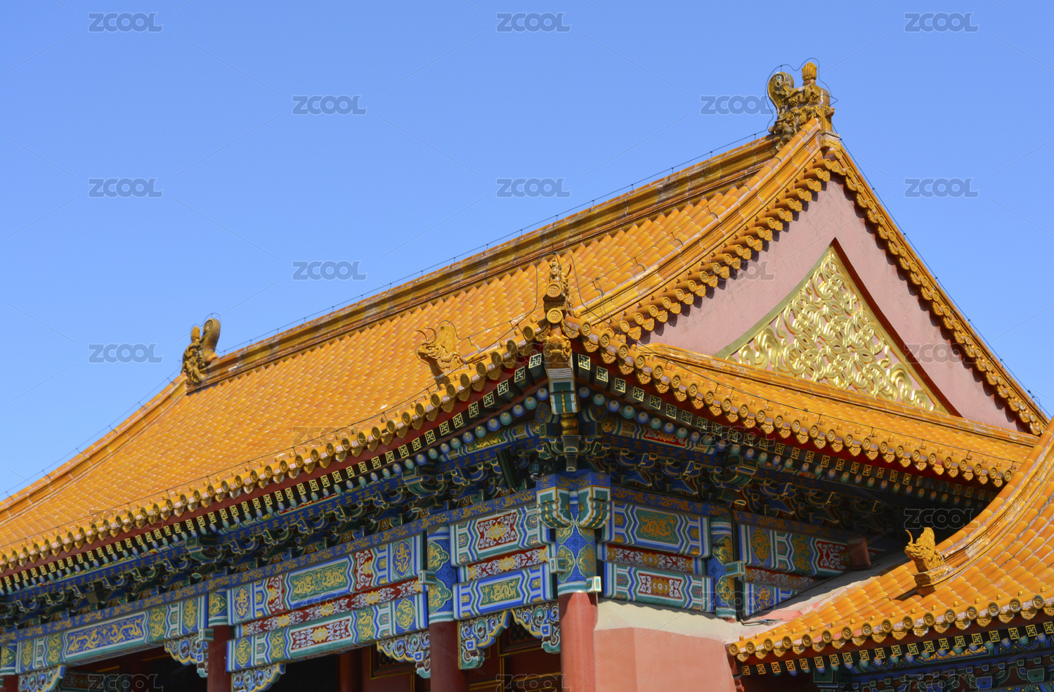 中国北京故宫的黄色琉璃彩绘镶金屋顶