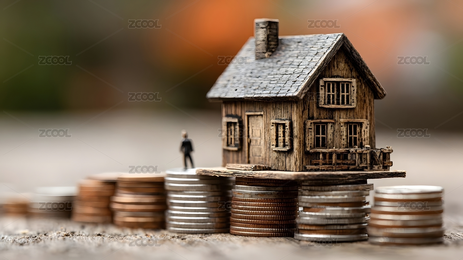 摞起来高低不同的美元硬币上放着各种袖珍房子模型