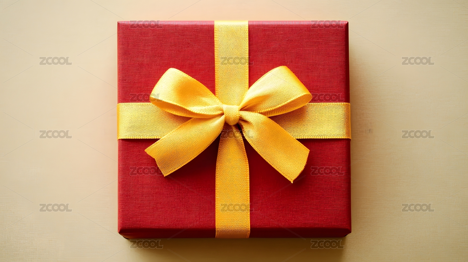 俯视放在红色背景的绑着香槟色带子的红色礼物盒