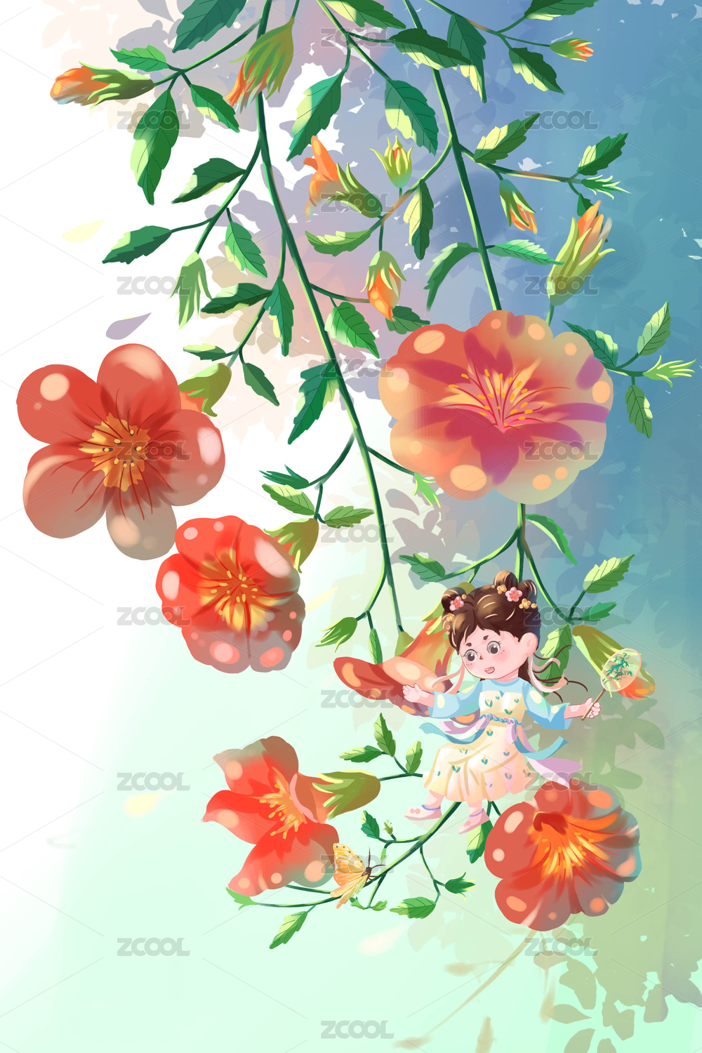 国风插画小女孩花朵