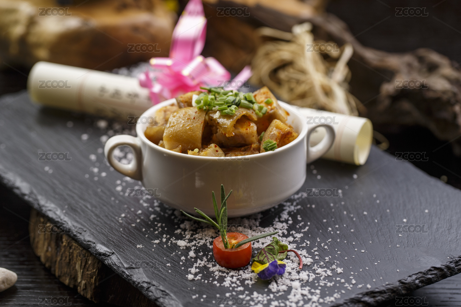 黑色石盘白色瓷盅盛装的川味辣猪皮