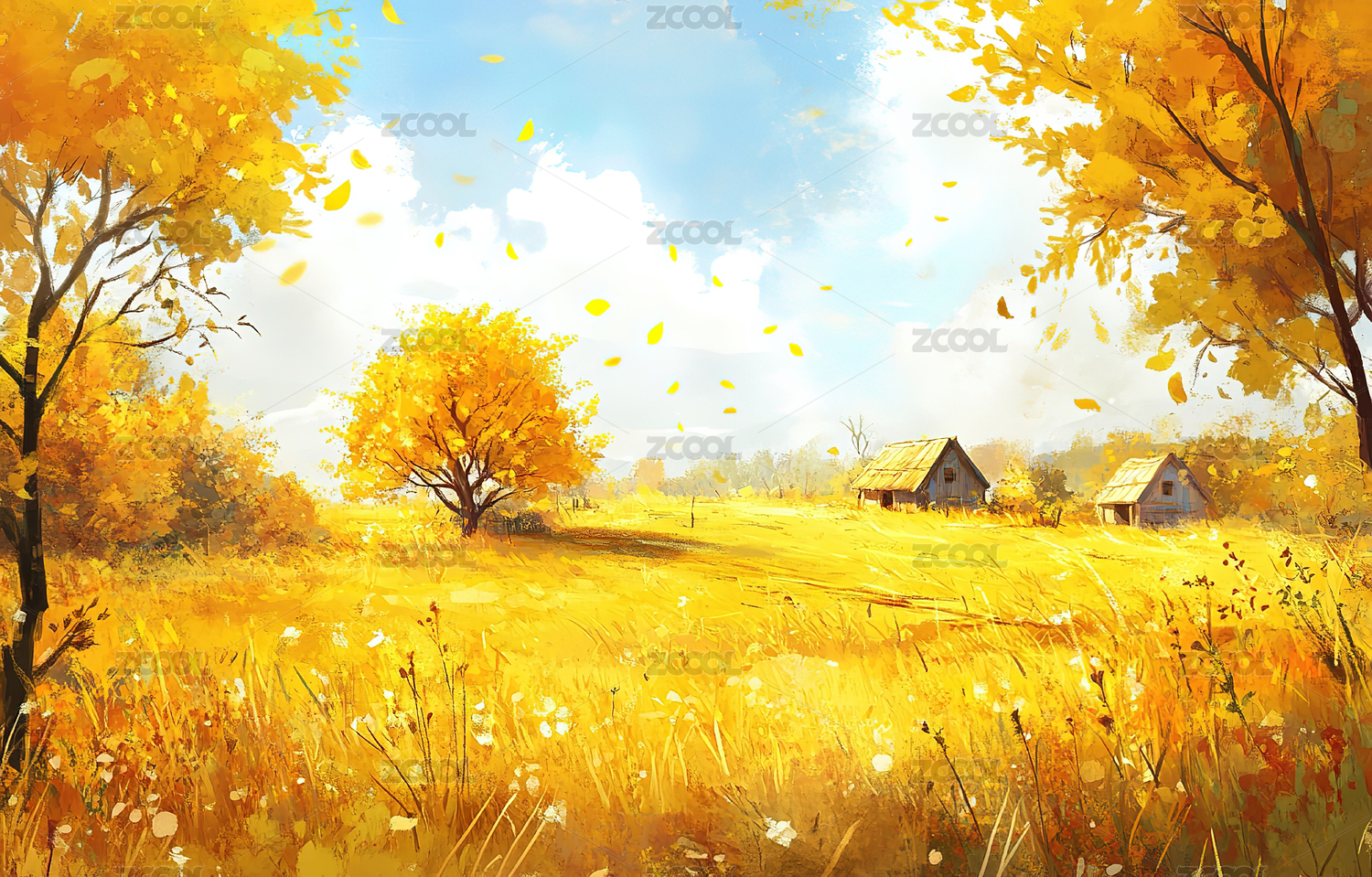秋天白天阳光明亮的金黄色原野3D插画背景