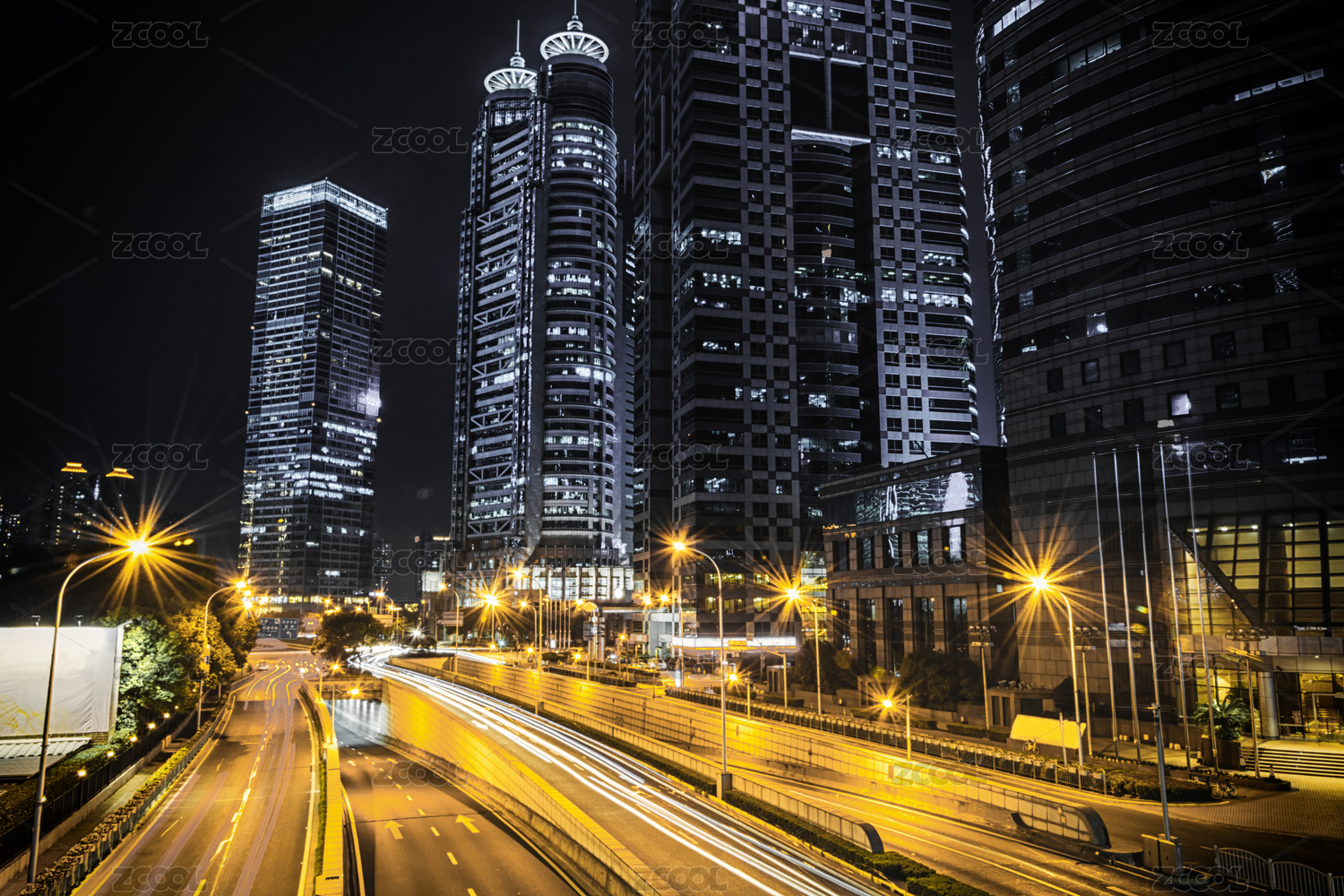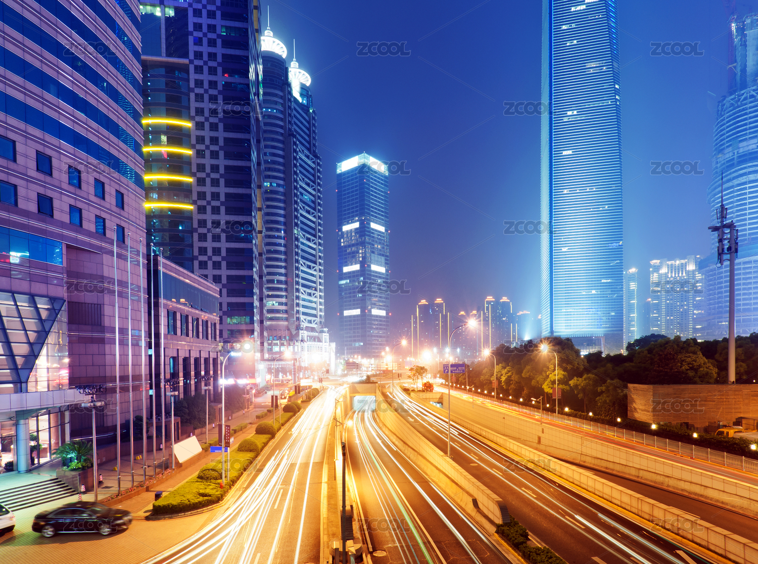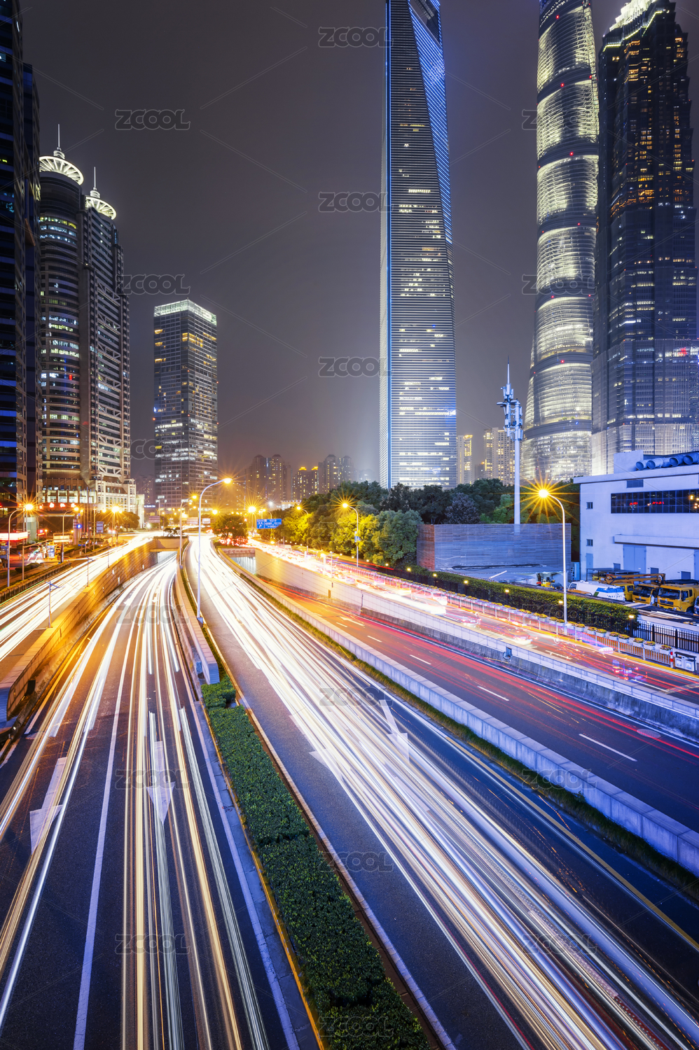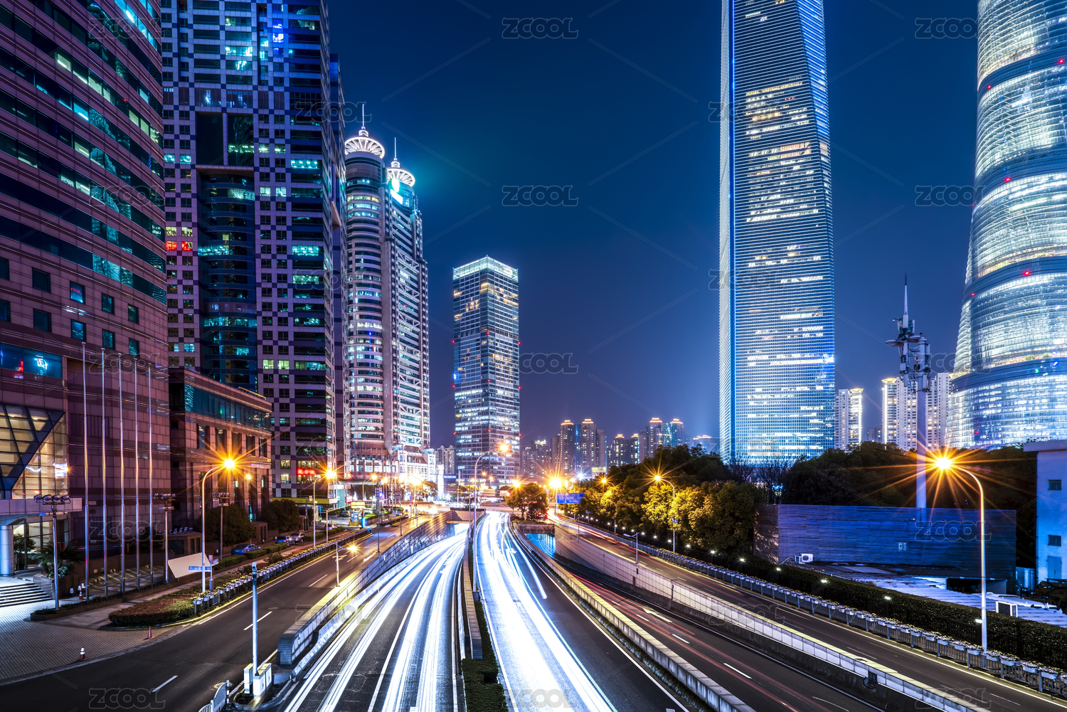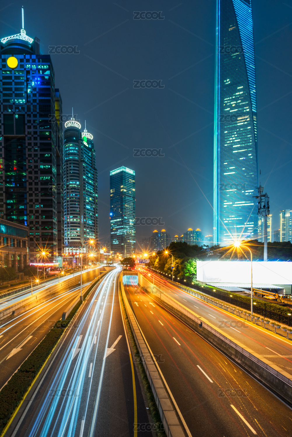 上海陆家嘴金融区建筑夜景和城市街道车流光影轨迹