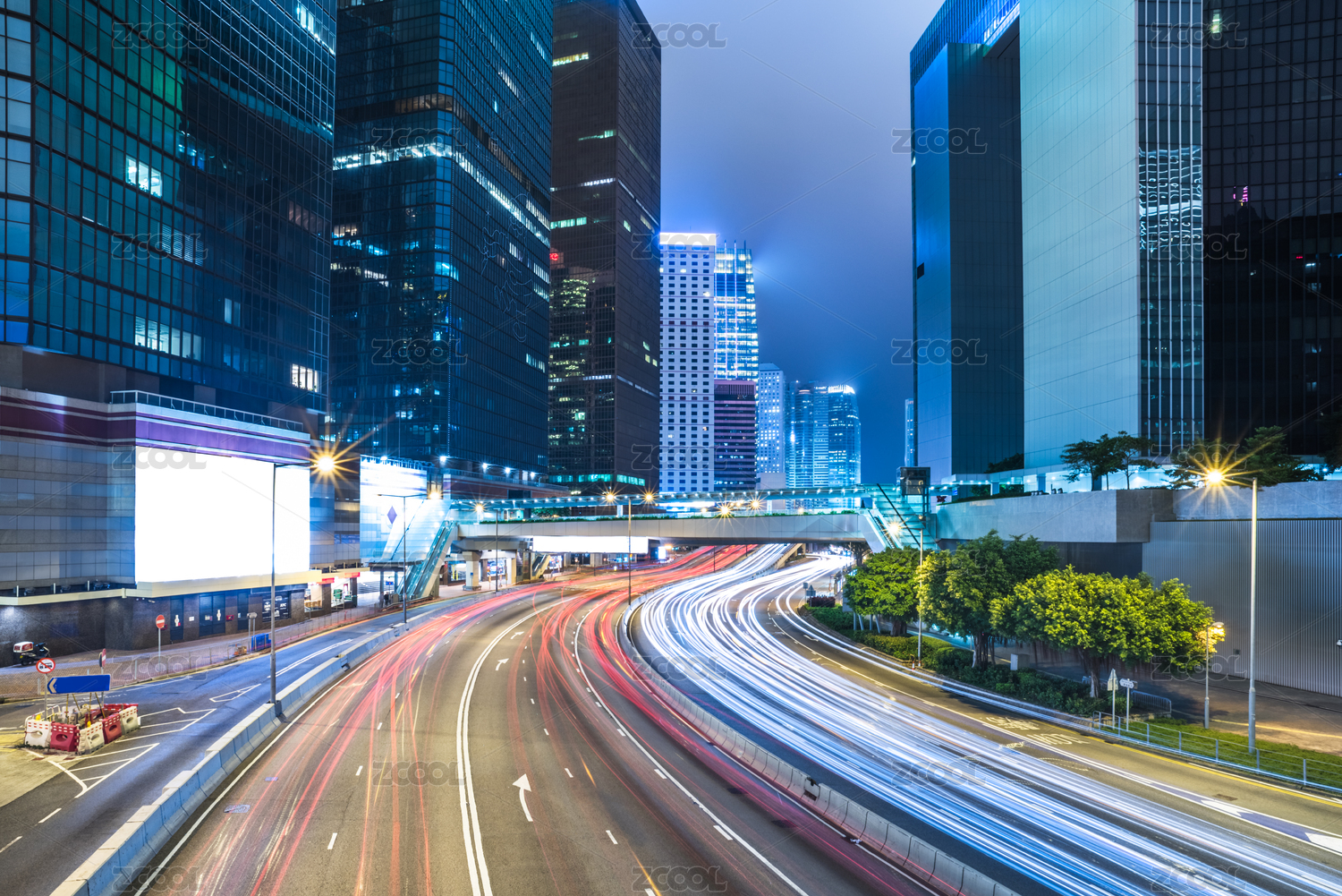 香港CBD夜景,飞驰的汽车尾灯形成的光的轨迹