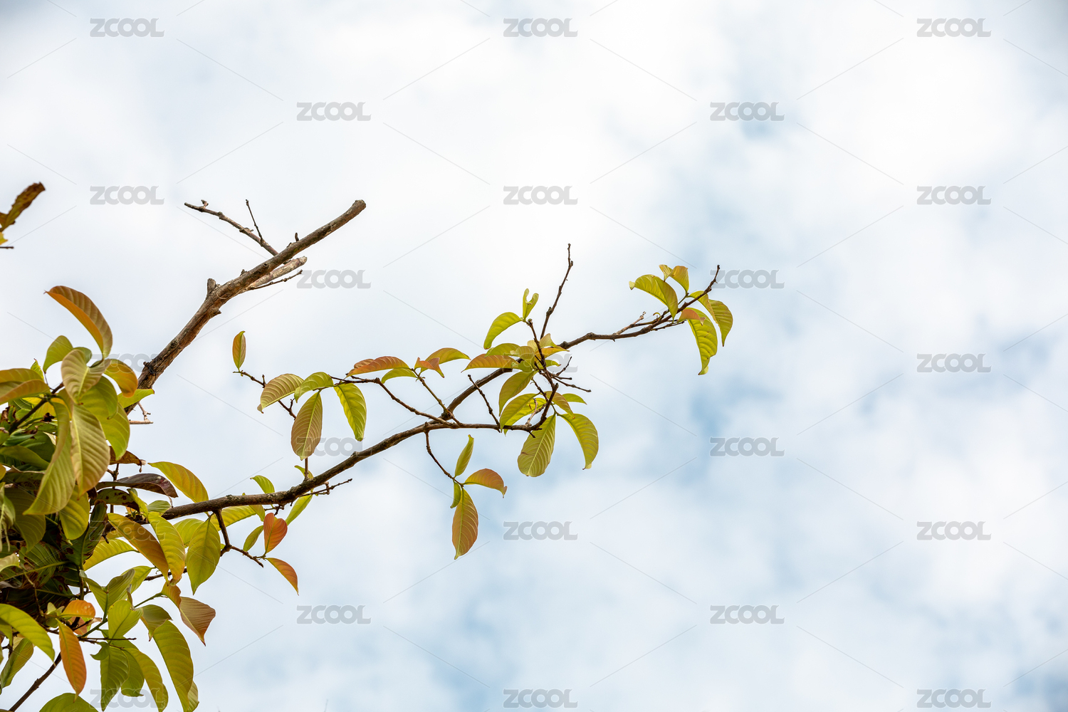 天空纯净背景下的嫩黄绿叶