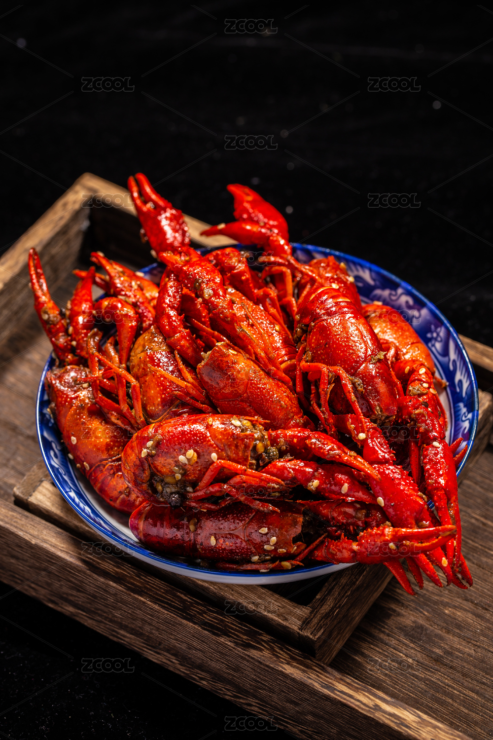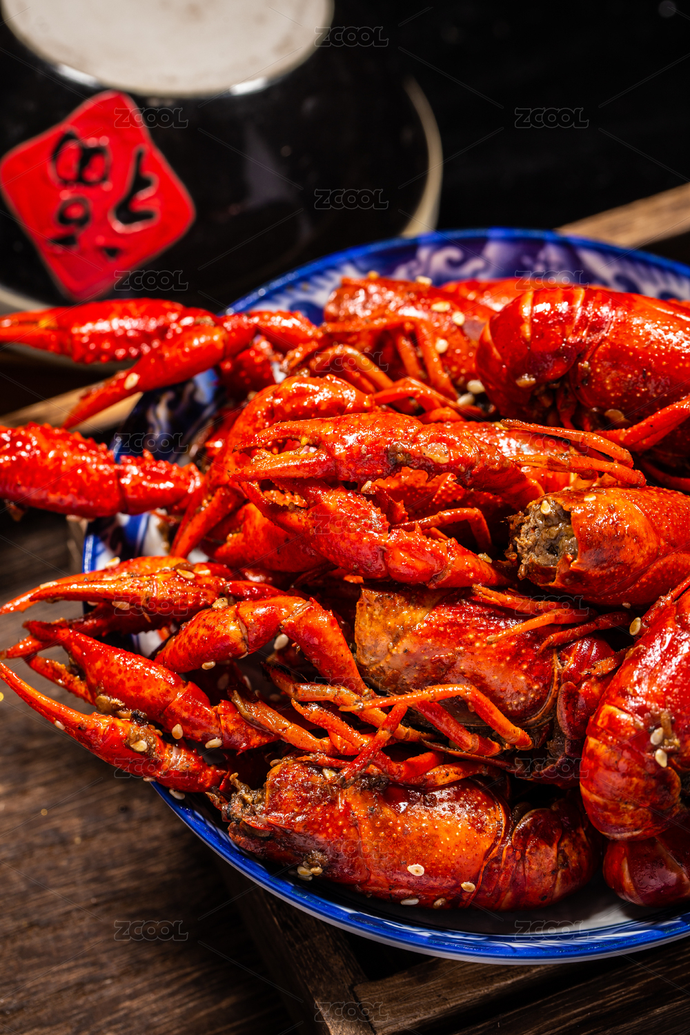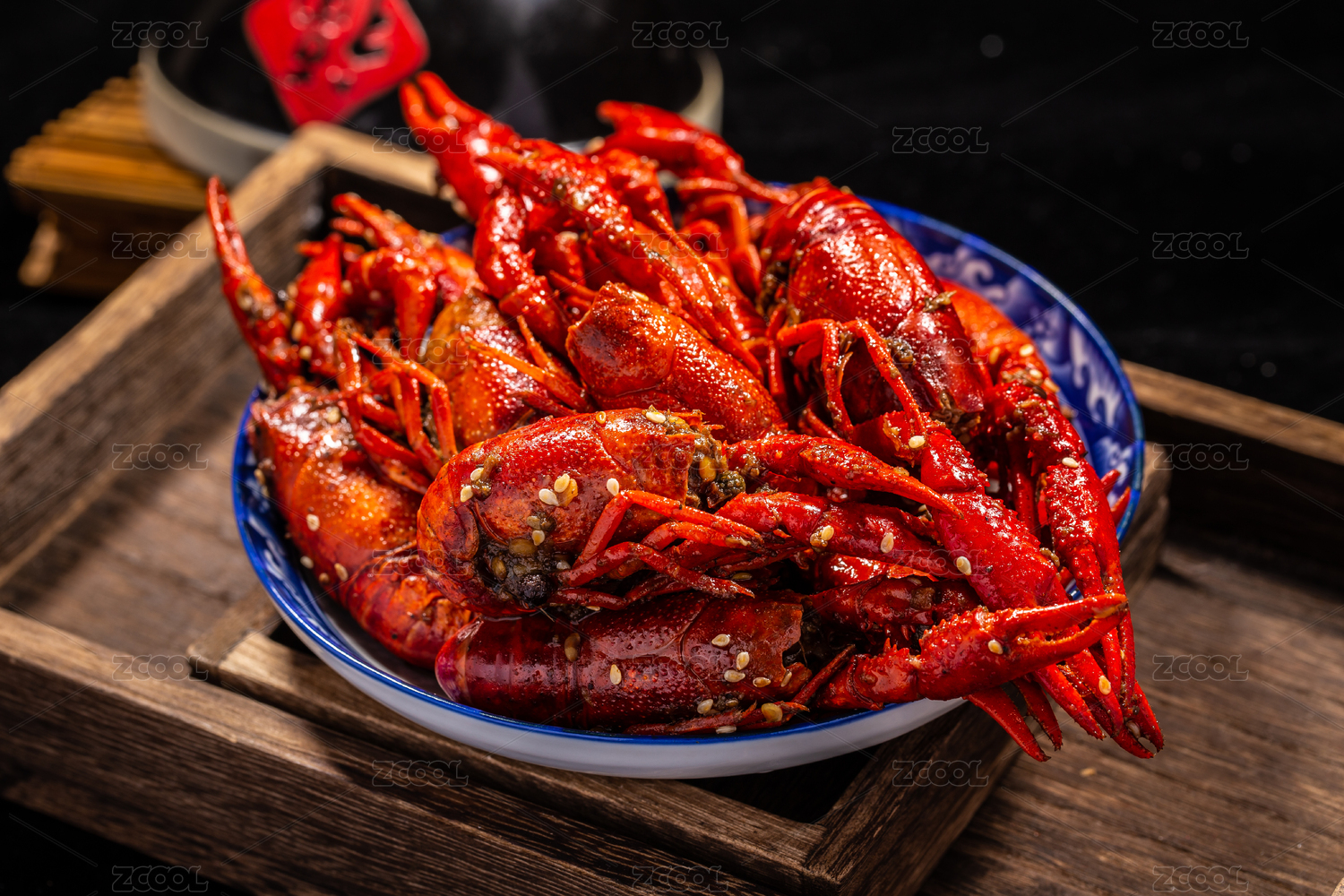 木板背景上满满一盘麻辣小龙虾