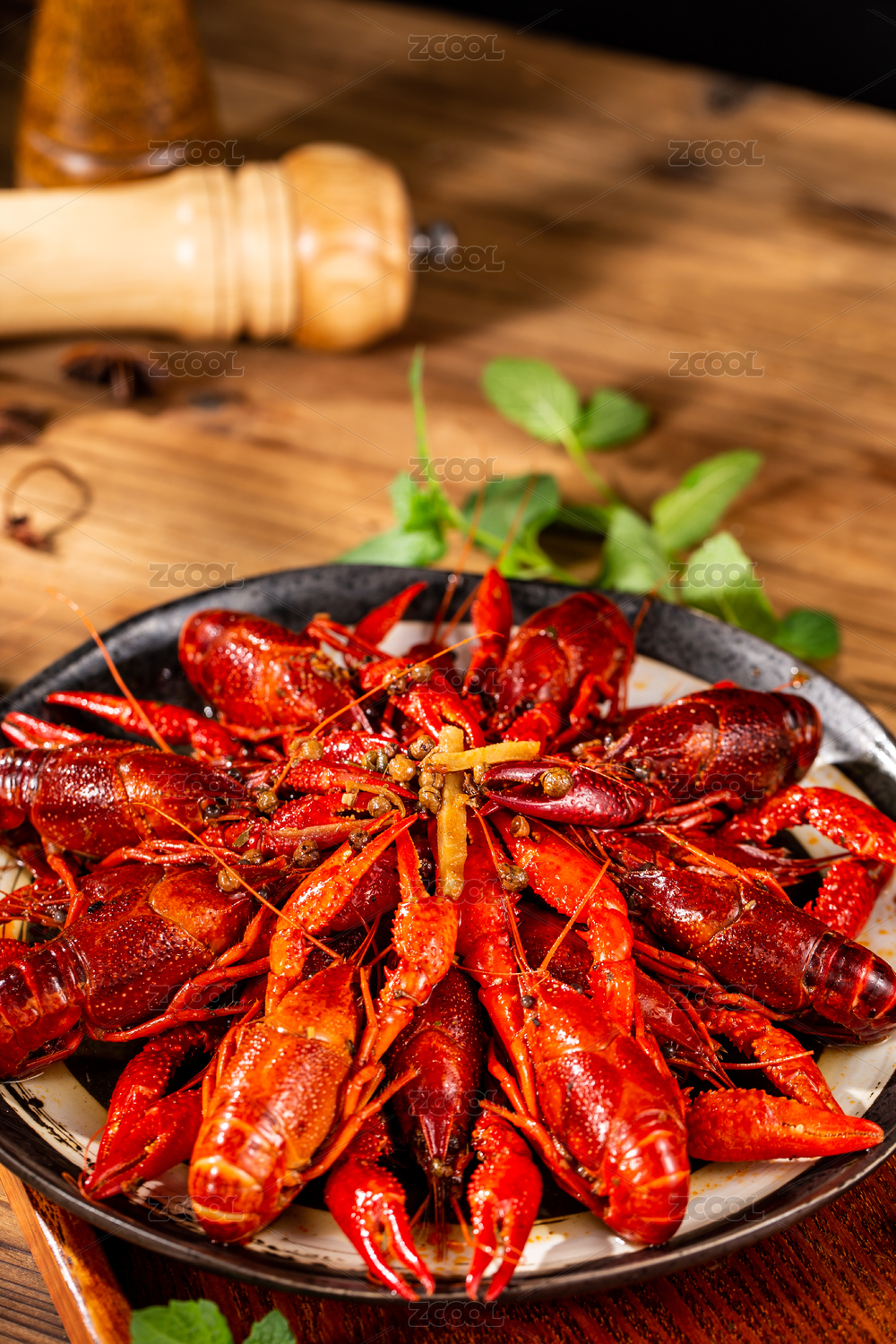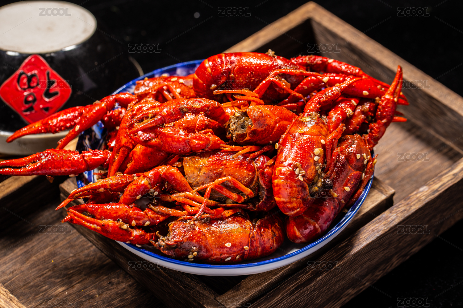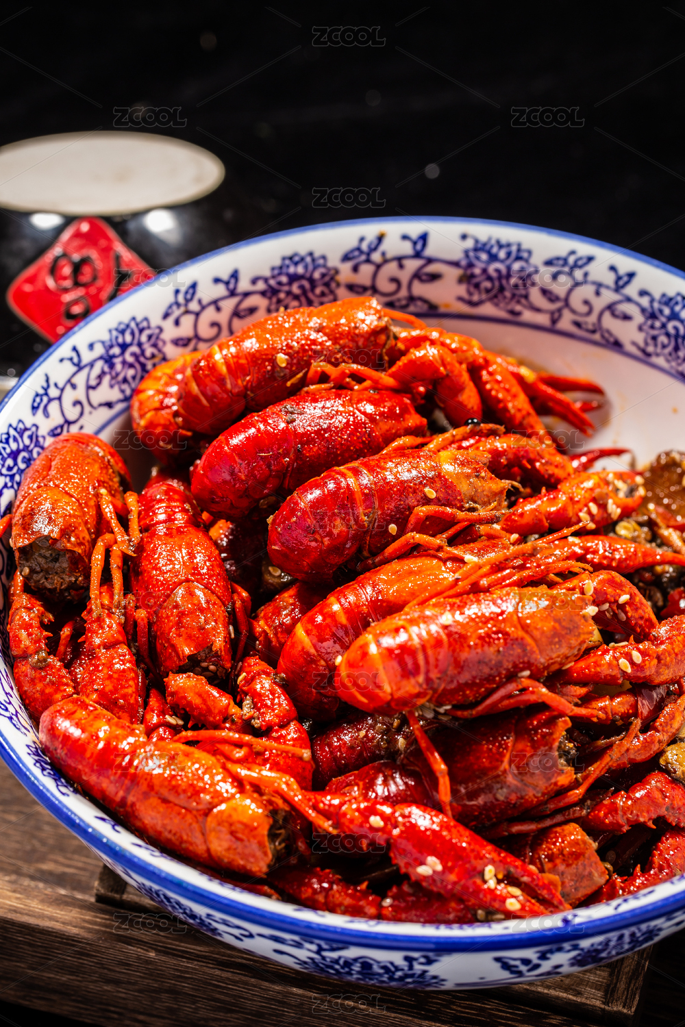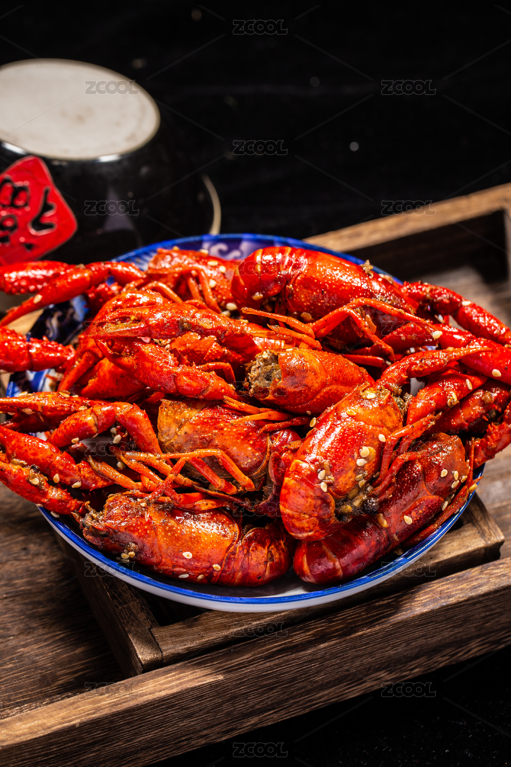 木板背景上满满一盘麻辣小龙虾