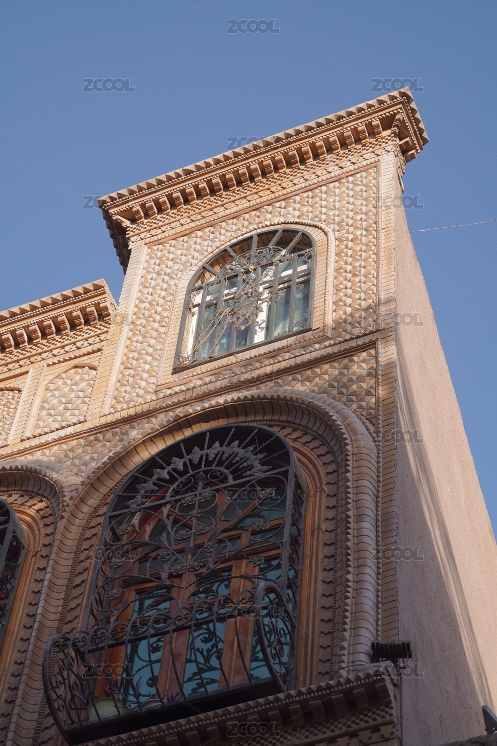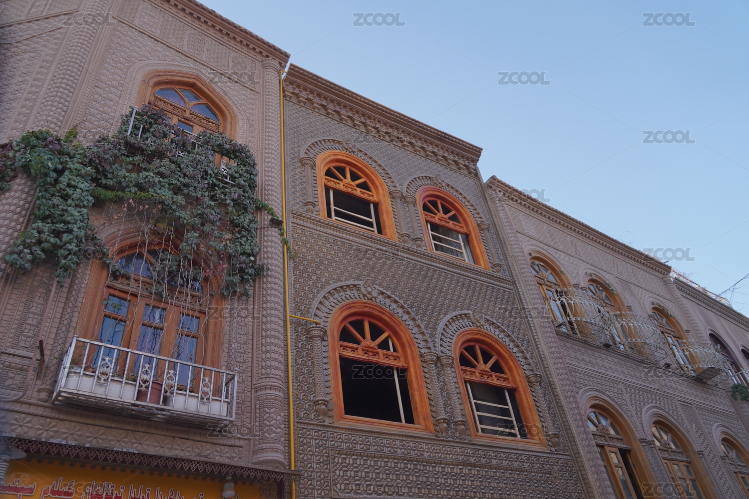 蓝天白云下的中国新疆喀什古城建筑特写镜头