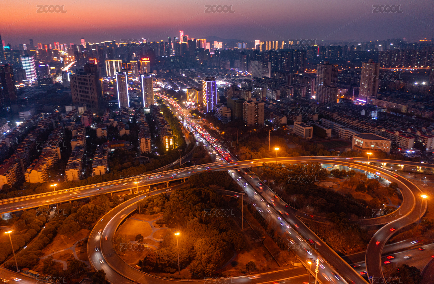 航拍傍晚的南京双桥门立交