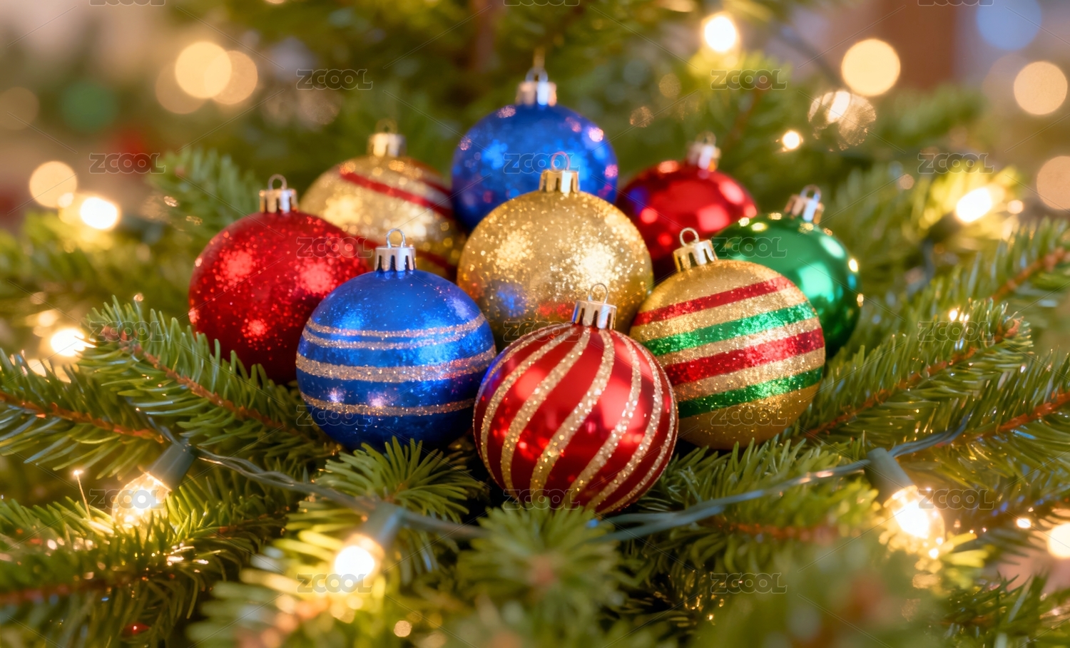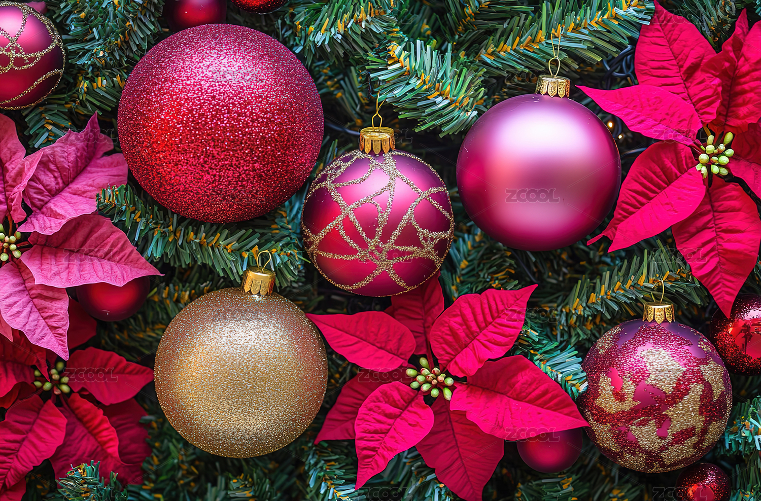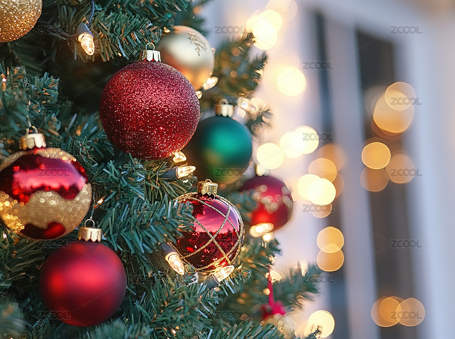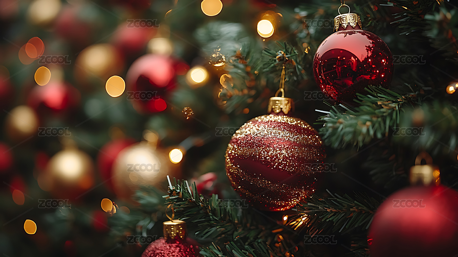悬挂在圣诞树上的红色磨砂质感圣诞球特写