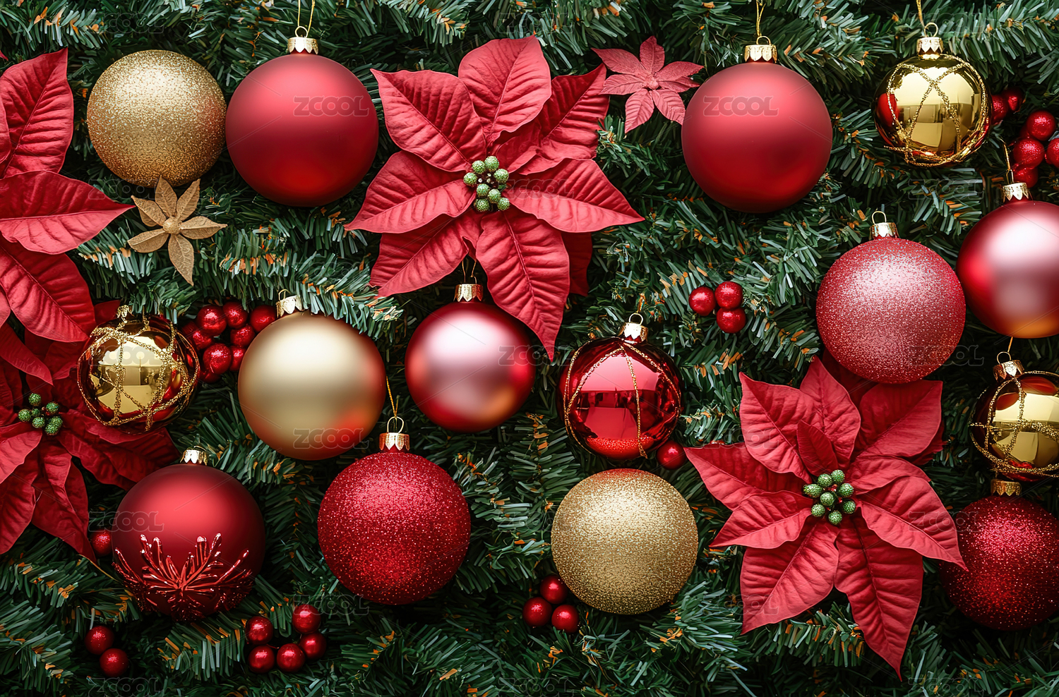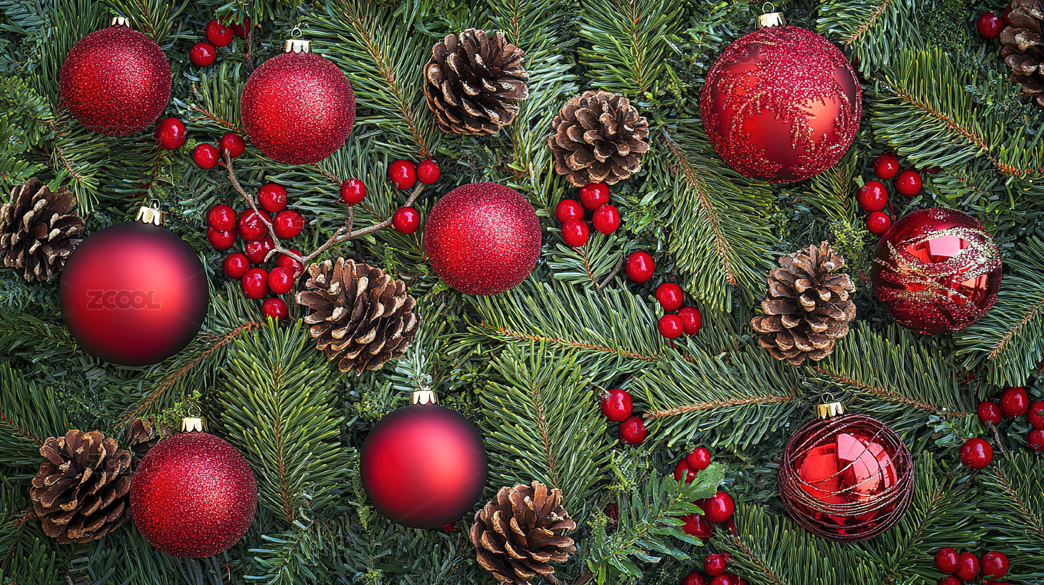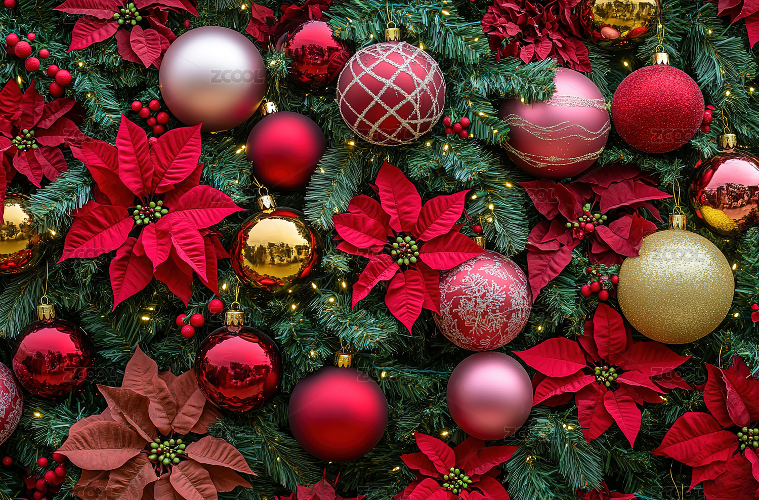 悬挂在圣诞树上的红色磨砂质感圣诞球特写