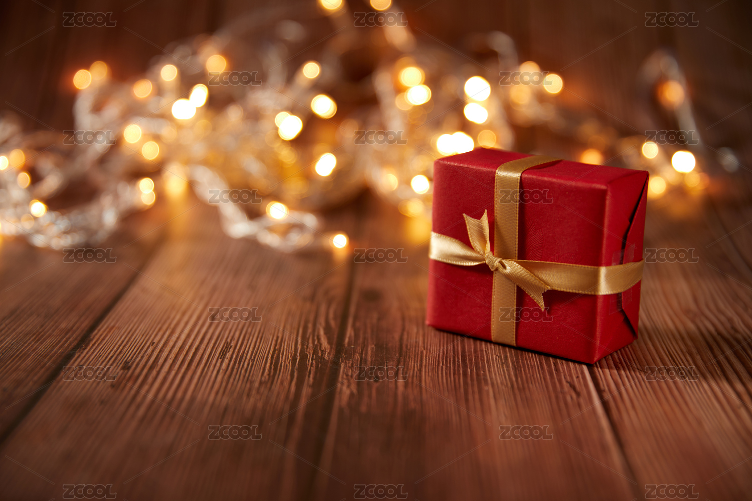 木质背景上的礼品盒,散景和模糊背景上的节