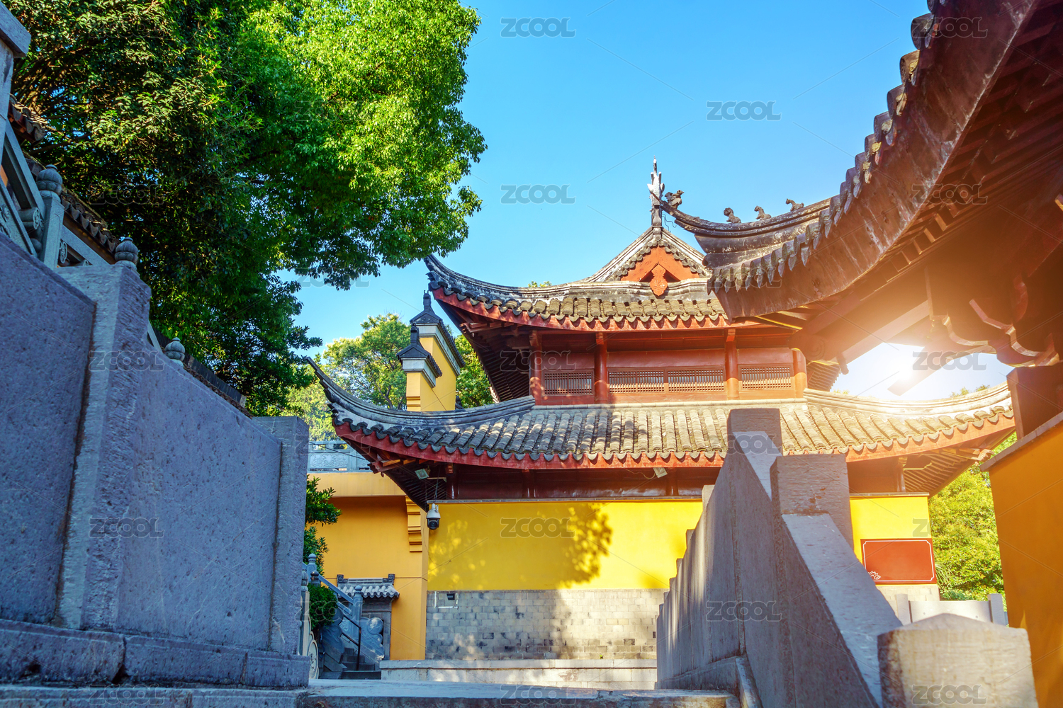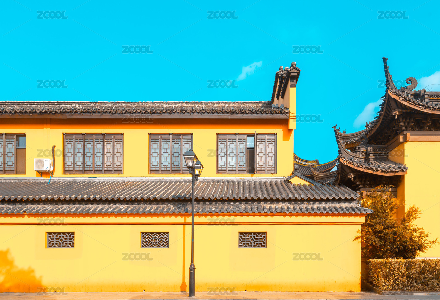 佛寺屋檐黄墙光影-苏州西园寺