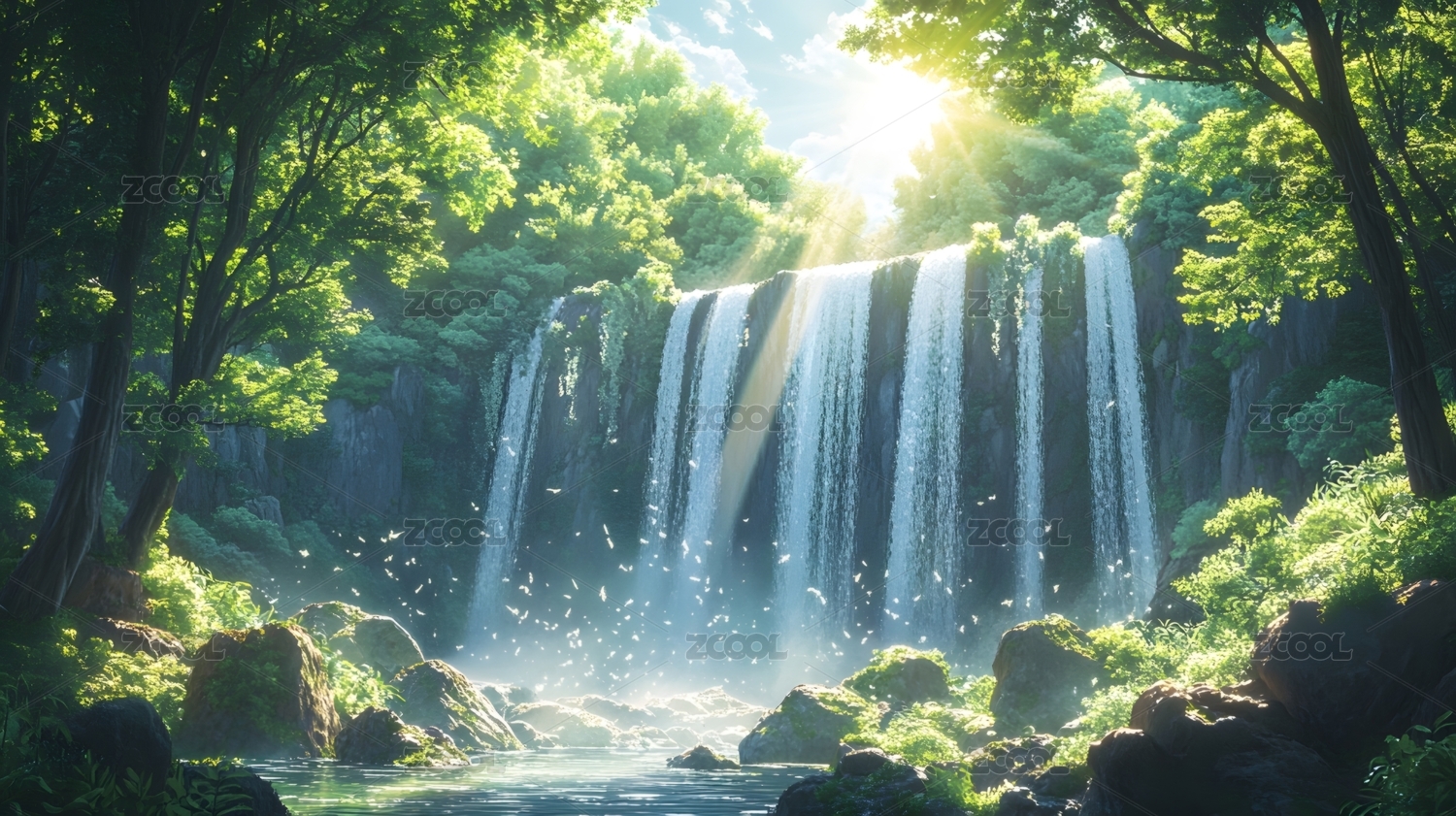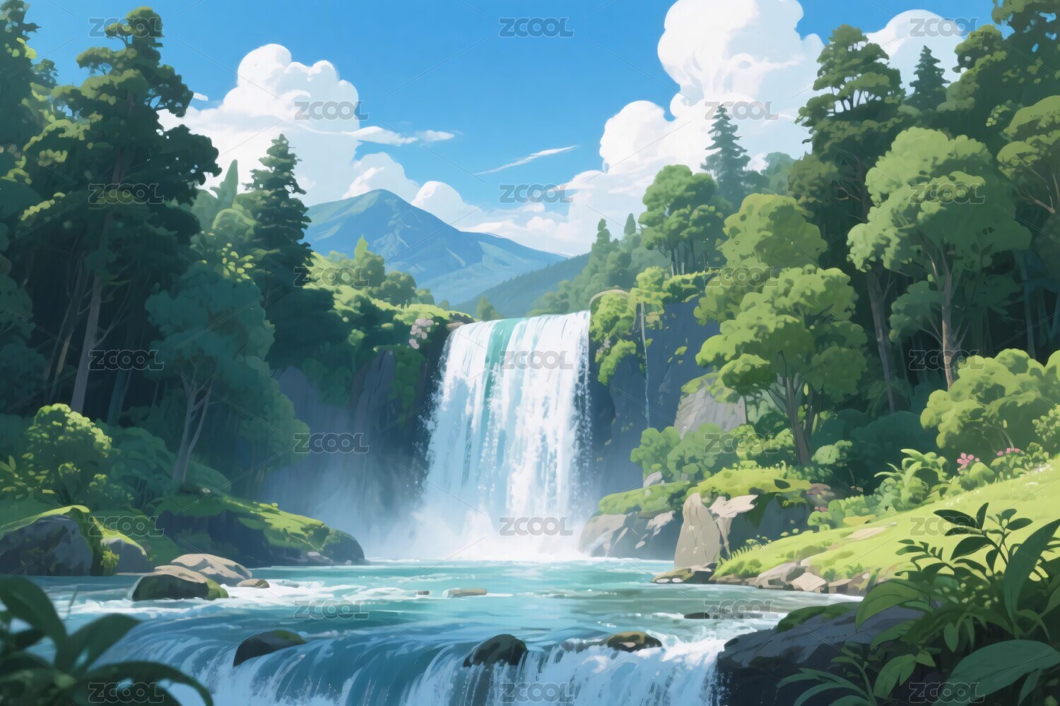 复古日漫夏季瀑布风景旅游旅行游玩景色