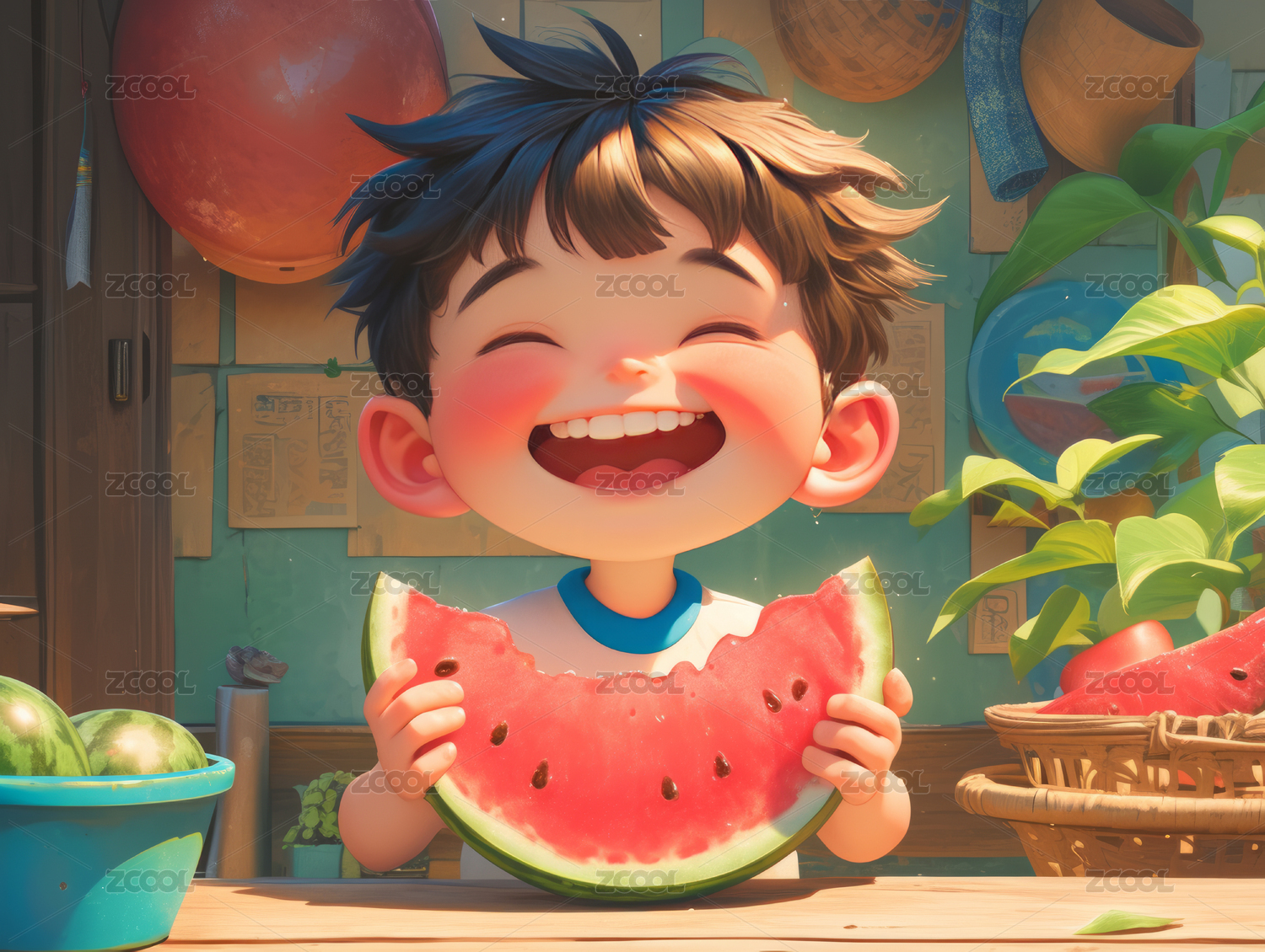 3D卡通夏日吃西瓜开心的孩子