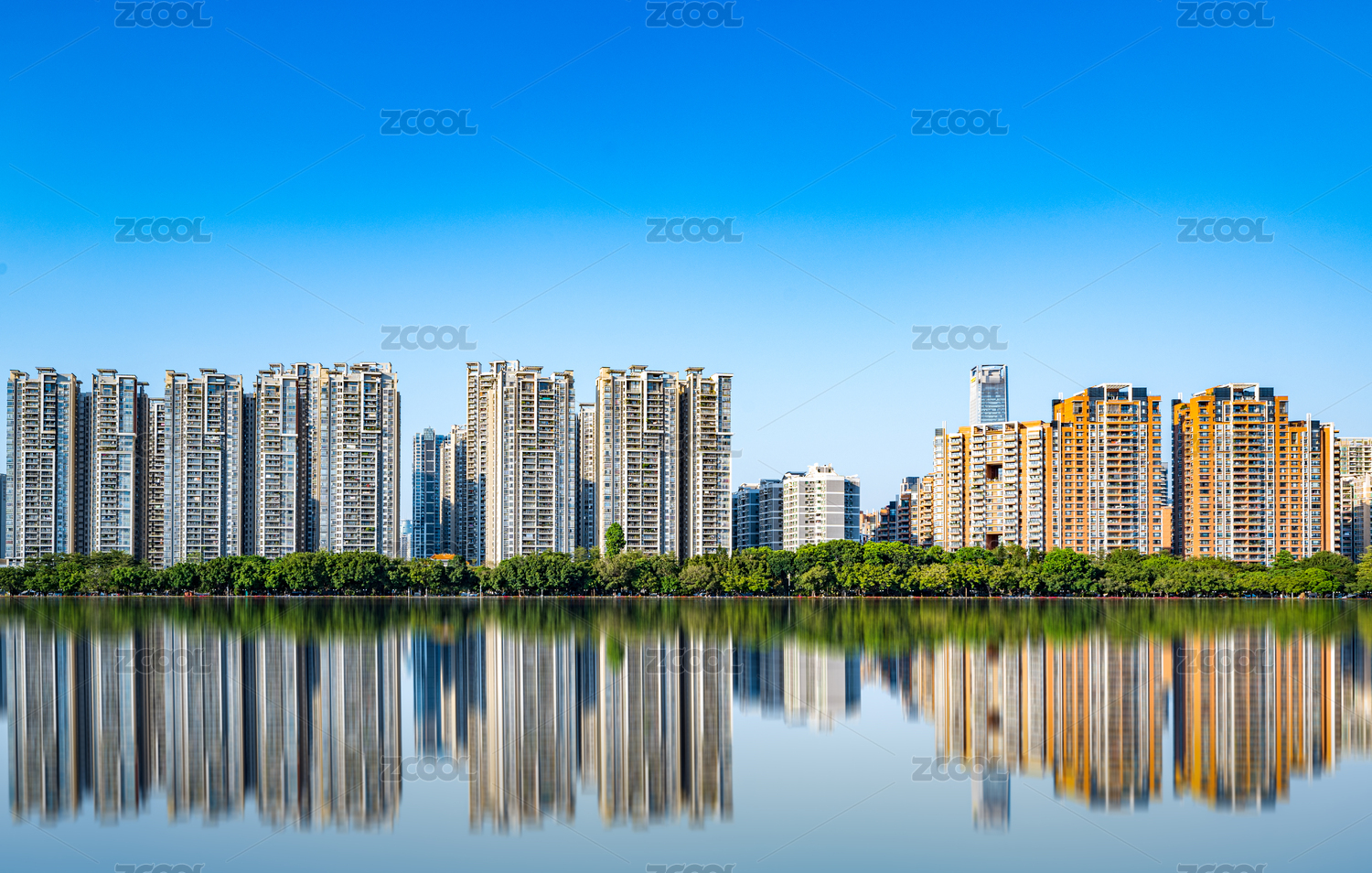广州南沙凤凰湖公园湖岸的住宅高楼