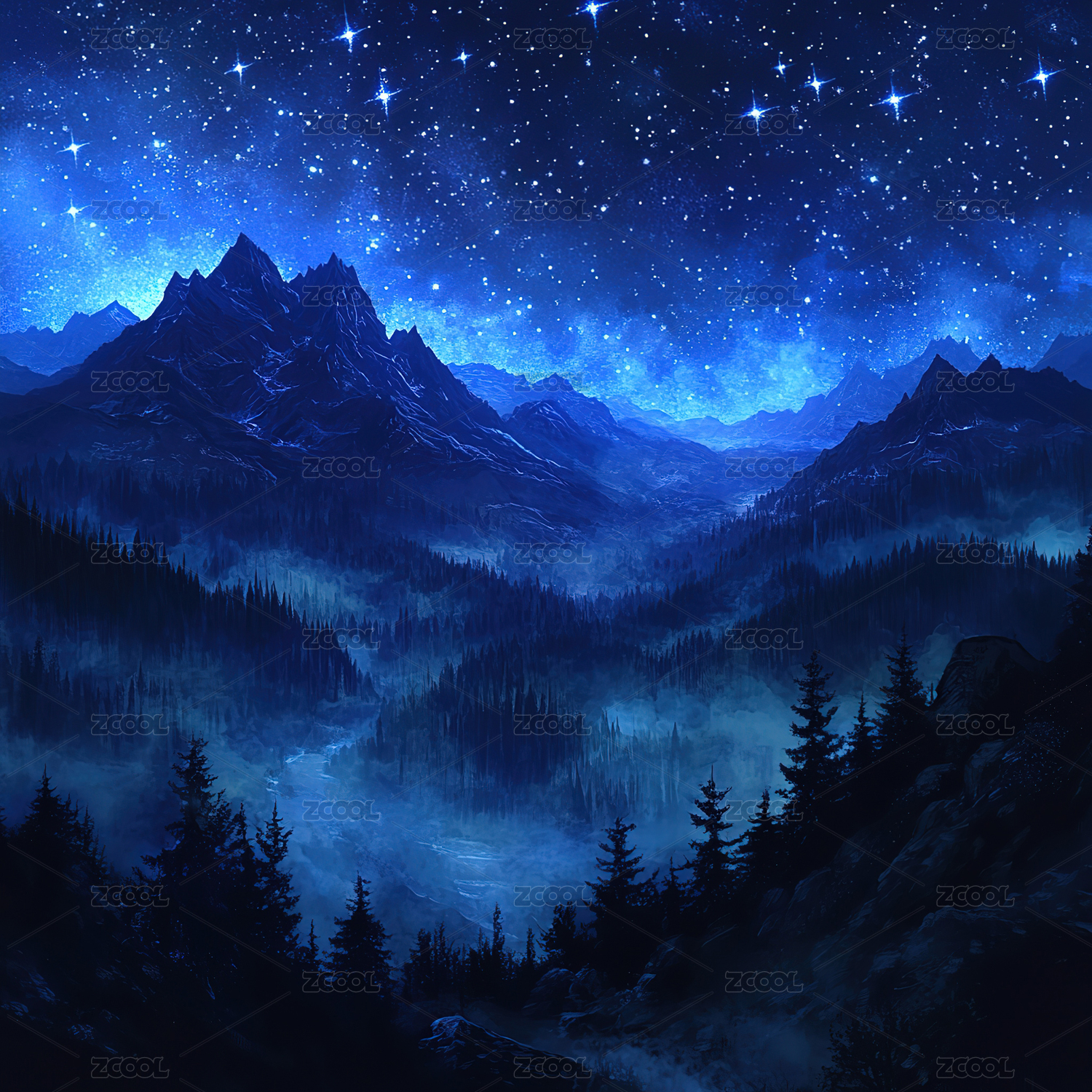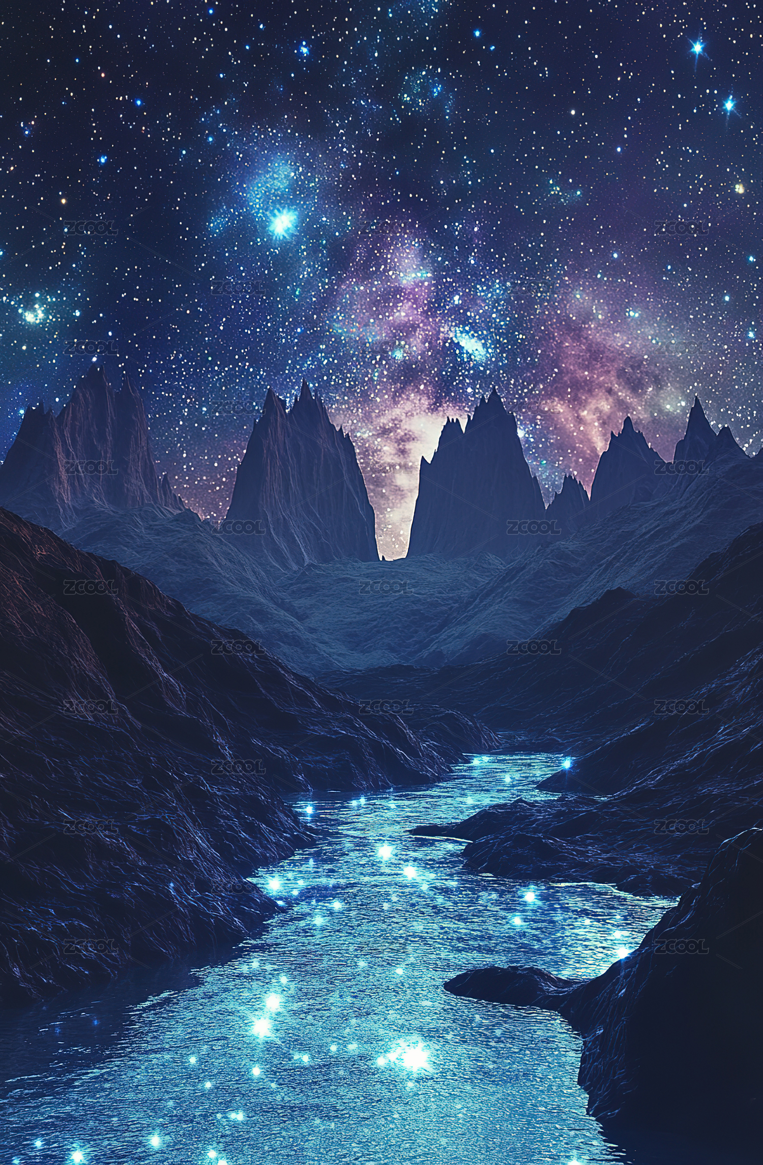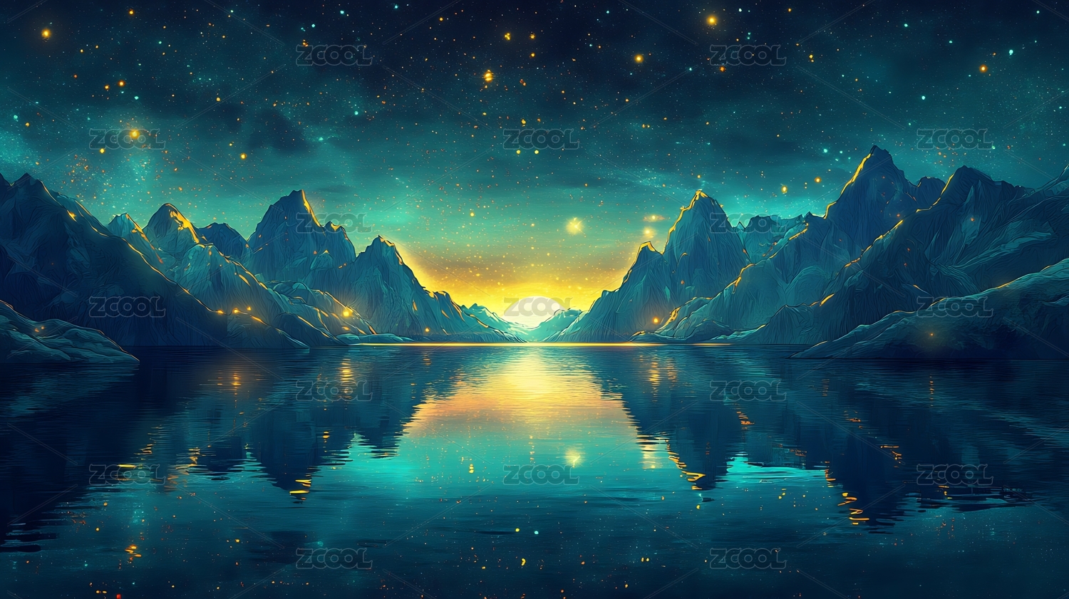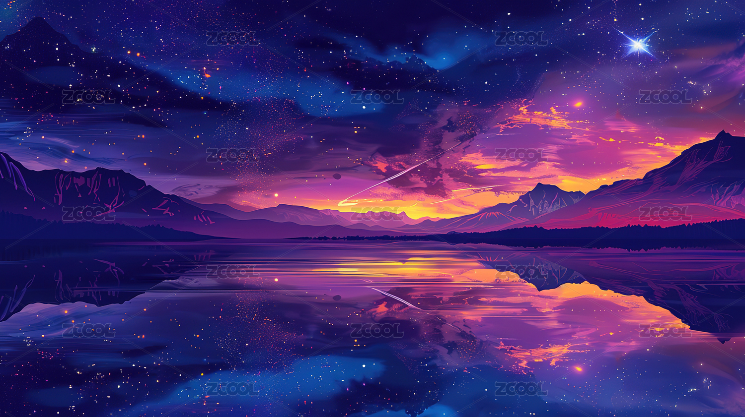 星河映照山峦湖面静谧倒影