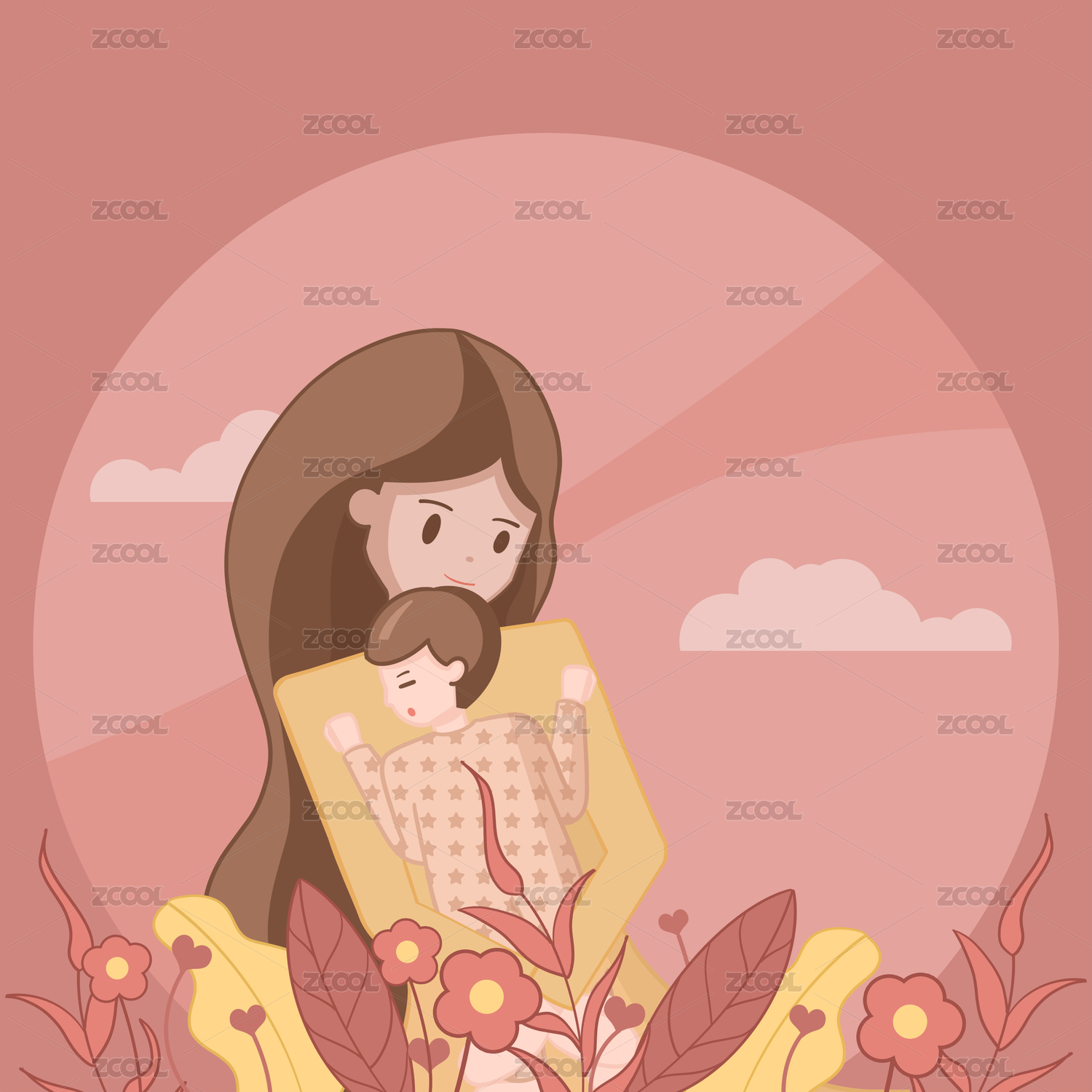 花丛中妈妈抱着孩子插画
