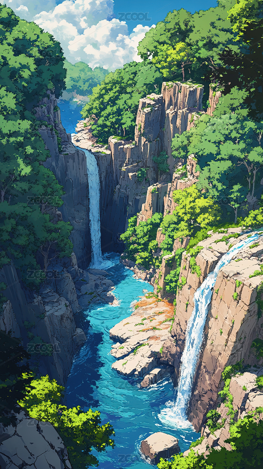 森林瀑布风景插画