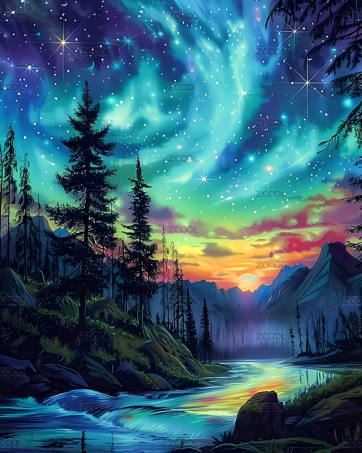 北极光下的森林插画