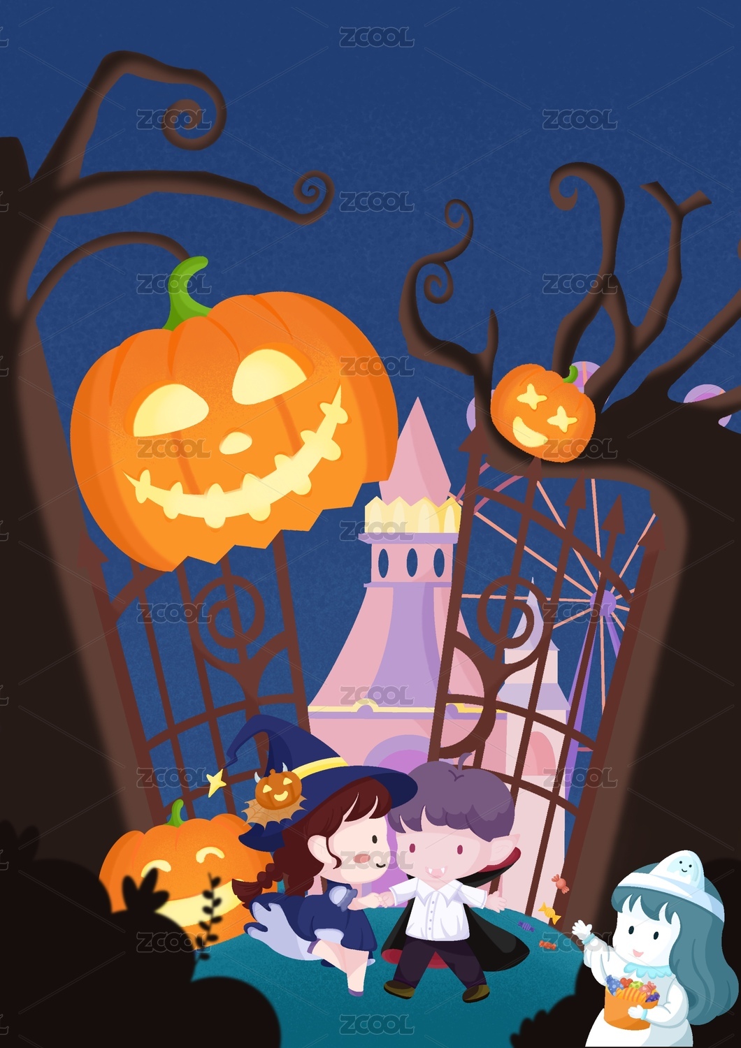 手绘卡通万圣节鬼怪魔女僵尸吸血鬼南瓜插画