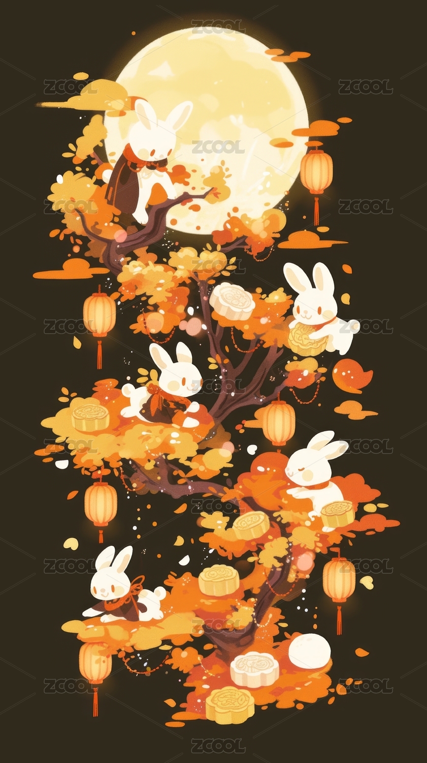 中秋,中秋节,玉兔,兔子,月饼,月亮,满月,桂花树,插画,可爱
