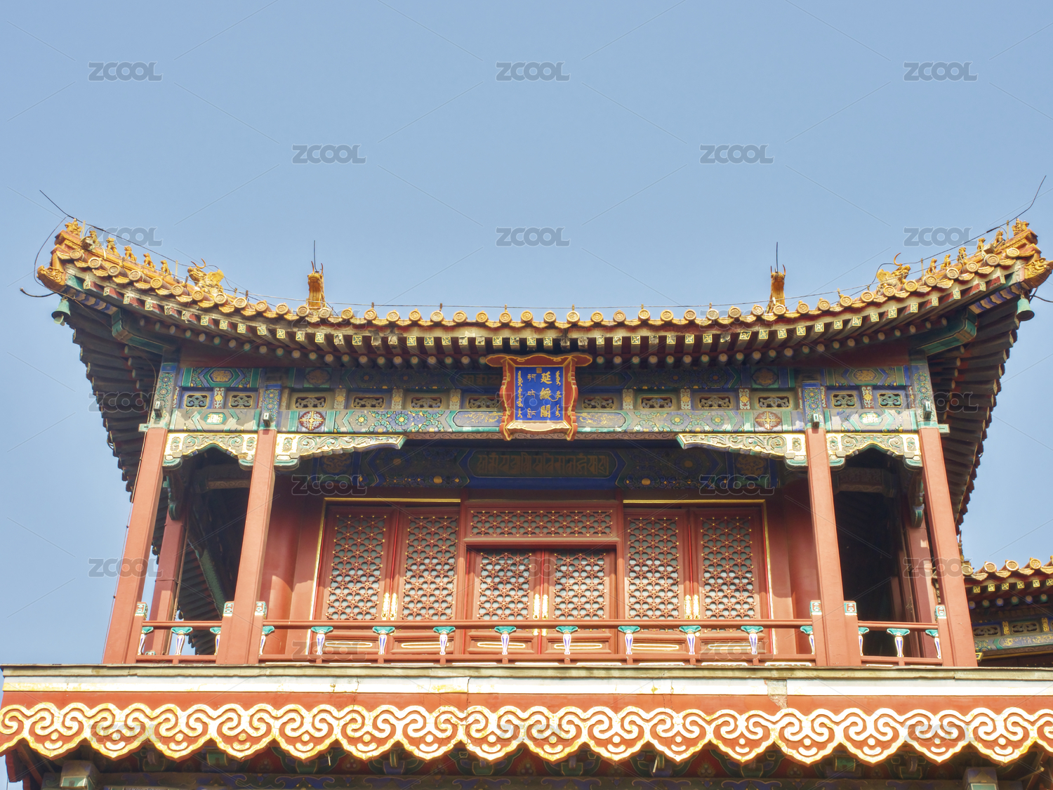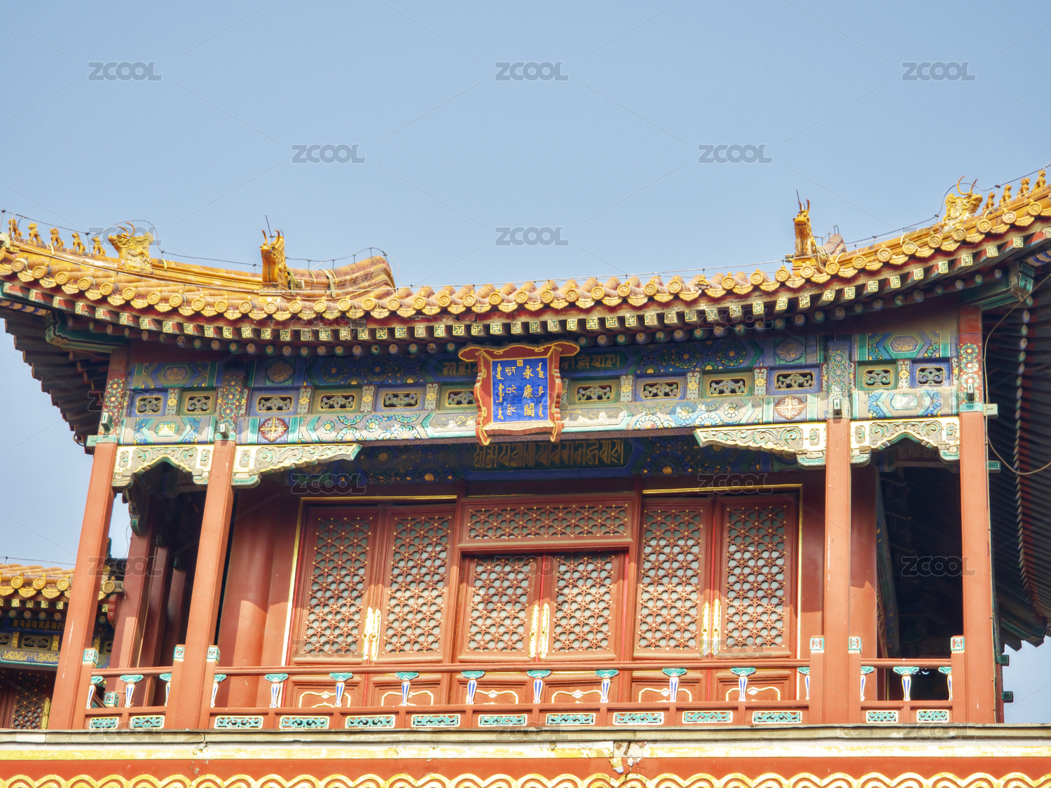 中国北京景山公园古建侧面一角—琉璃瓦屋顶飞檐彩绘描金万字纹龙纹