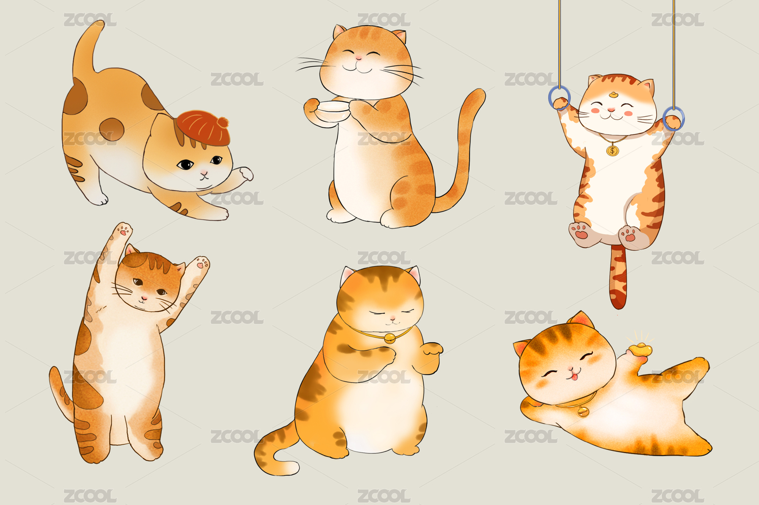 各种不同姿势的橙色猫插图,快乐的玩耍
