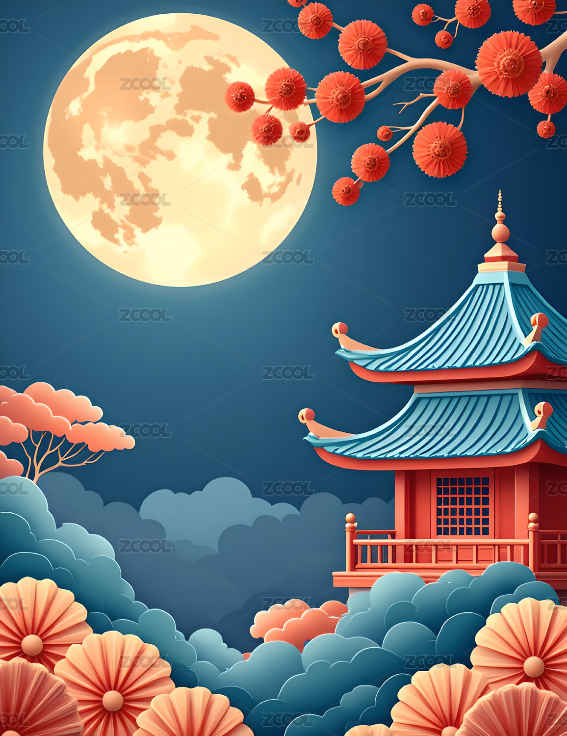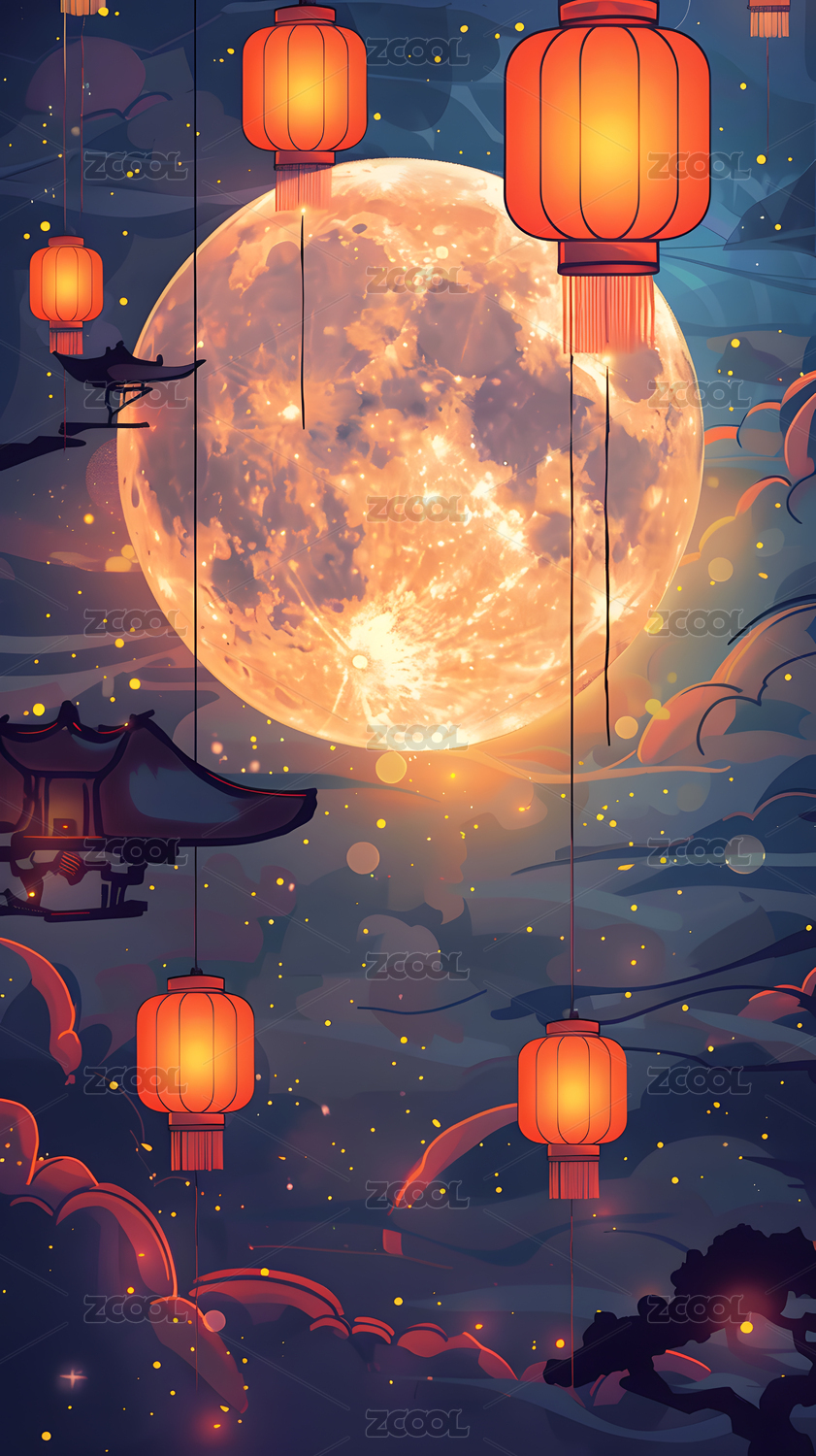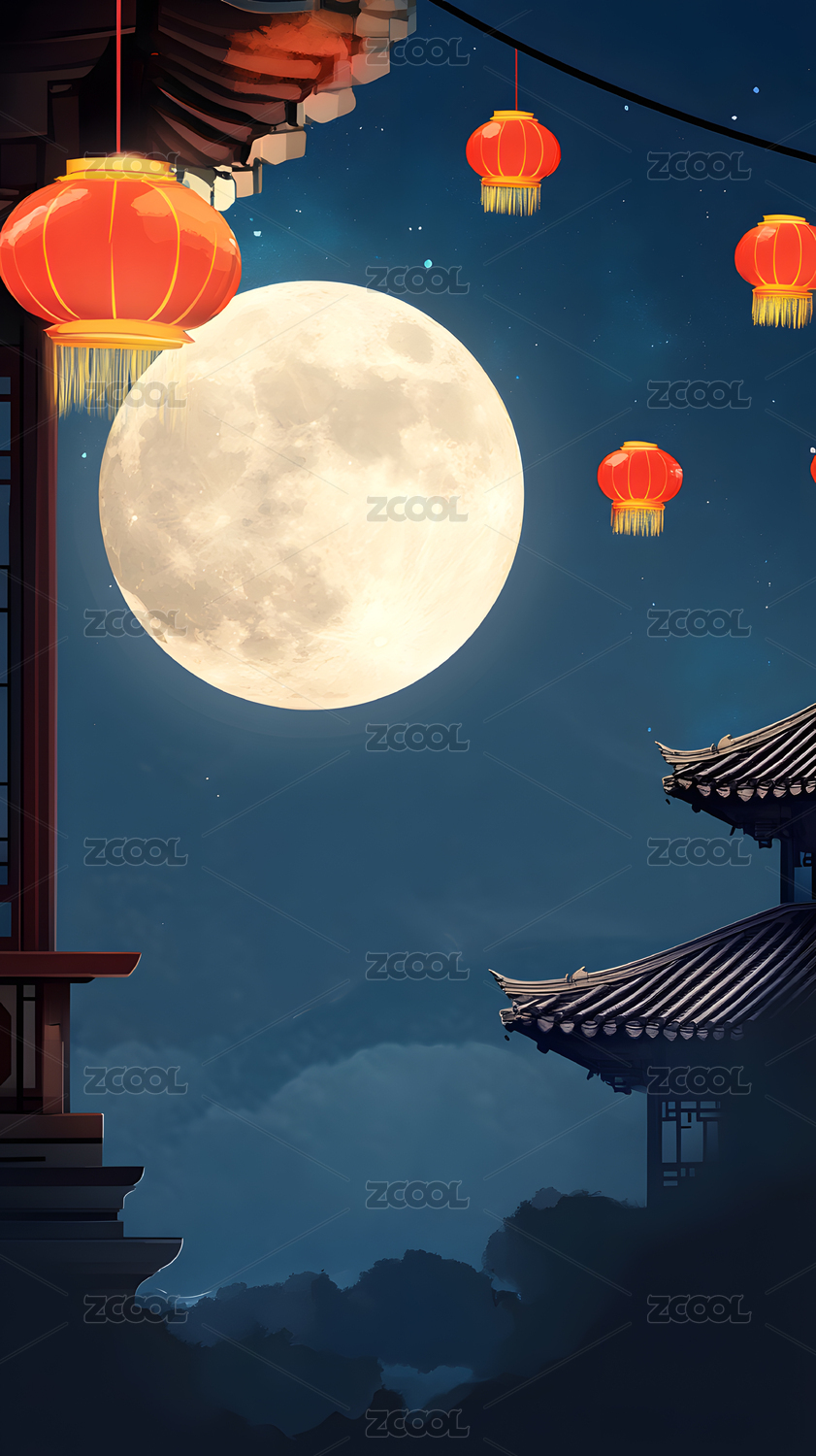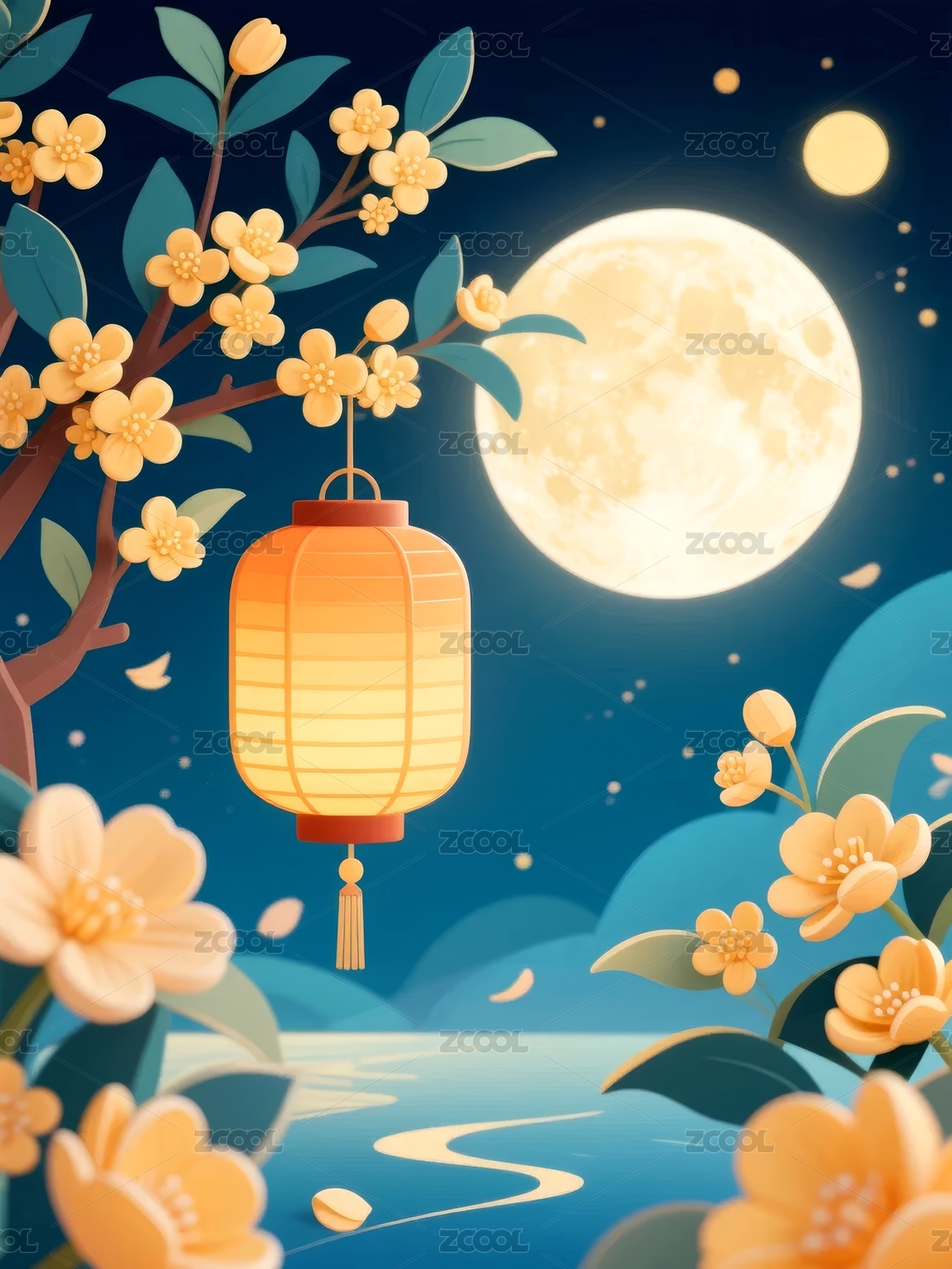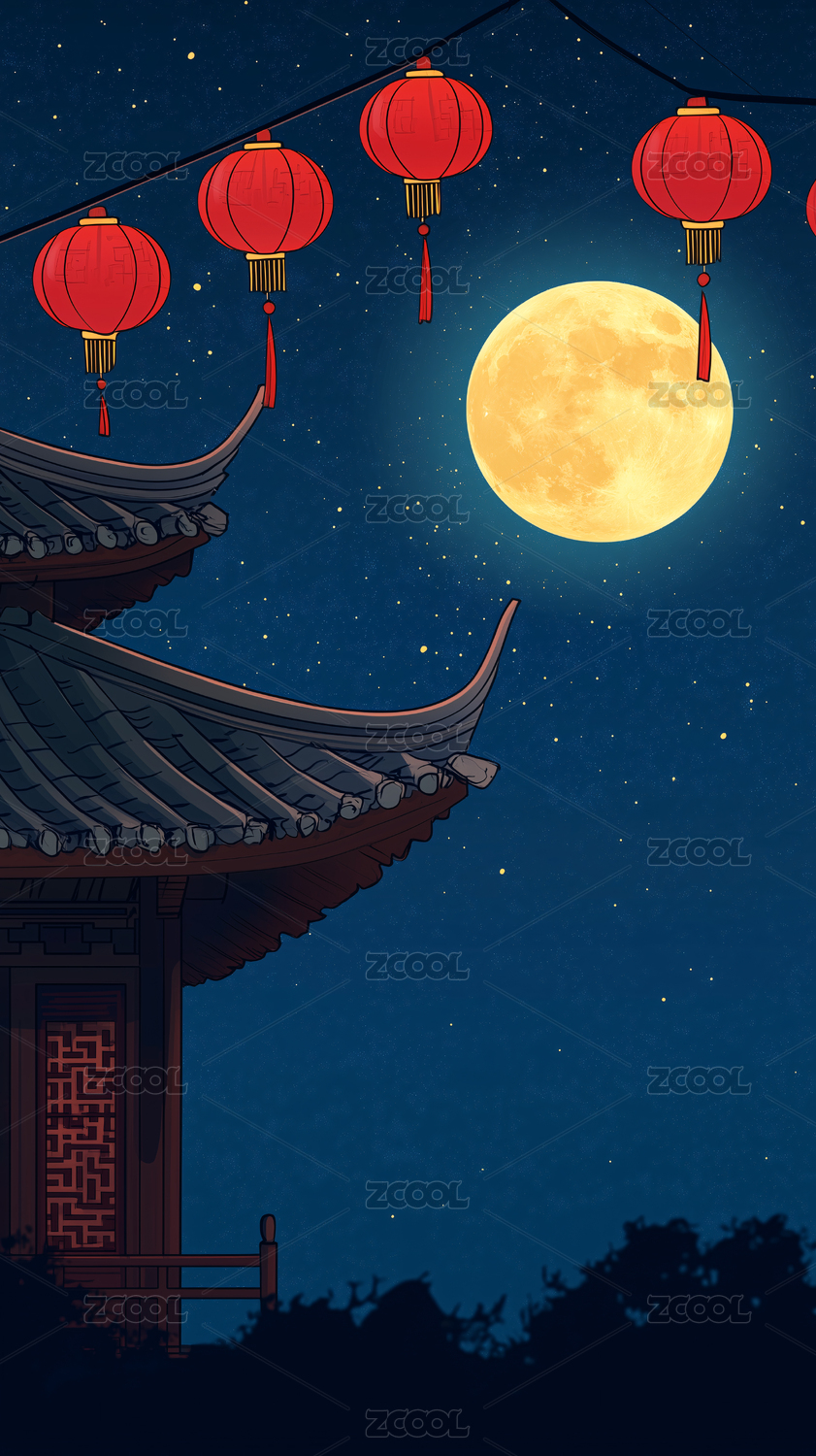 插画,月亮,风景,树,自然,中秋节,节日,传统,夜晚,国风