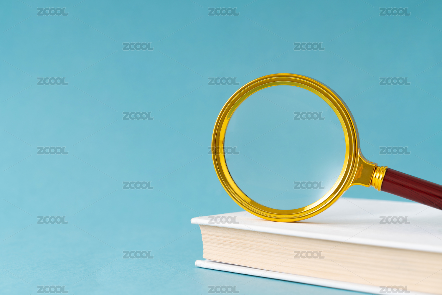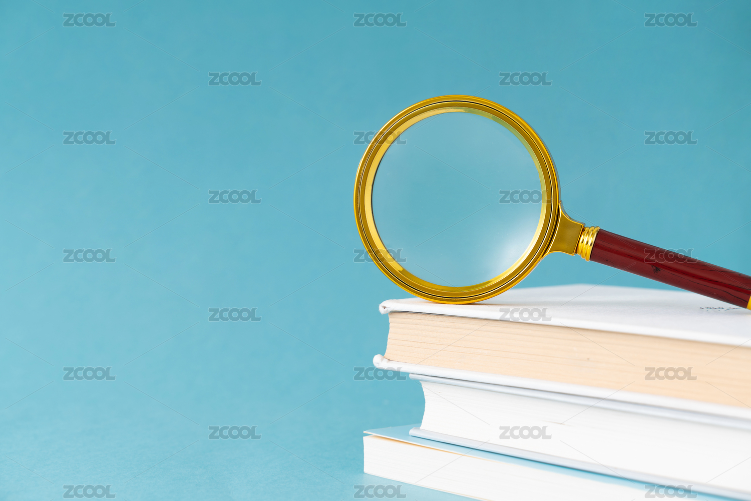 金色的放大镜摆放在书籍上,蓝色背景