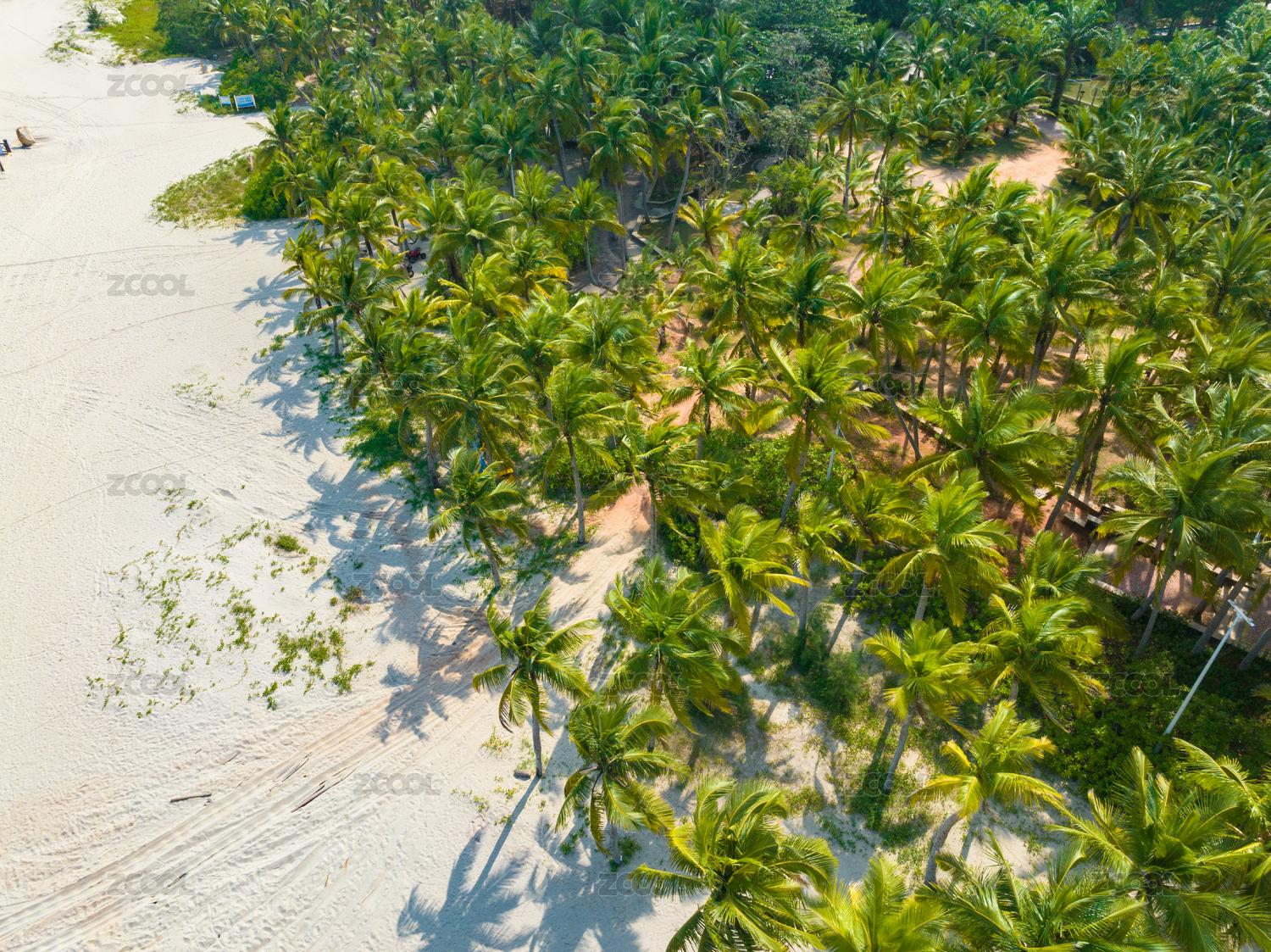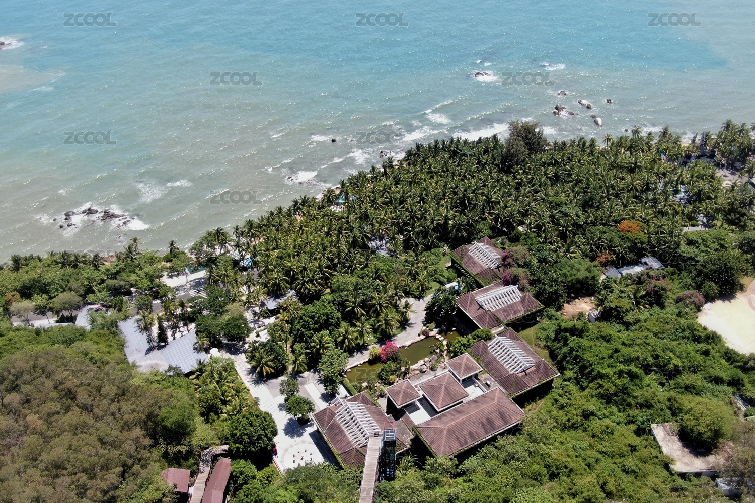 航拍热带海岛的椰林草地和度假酒店