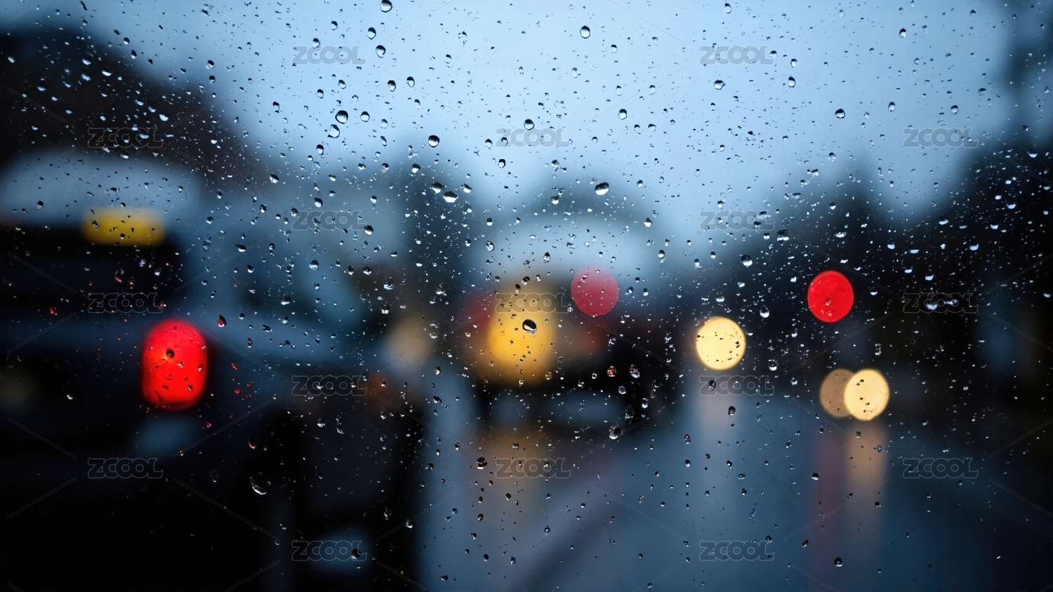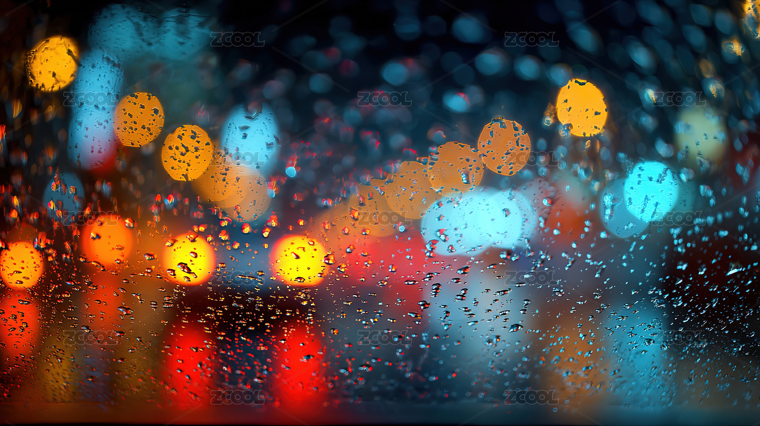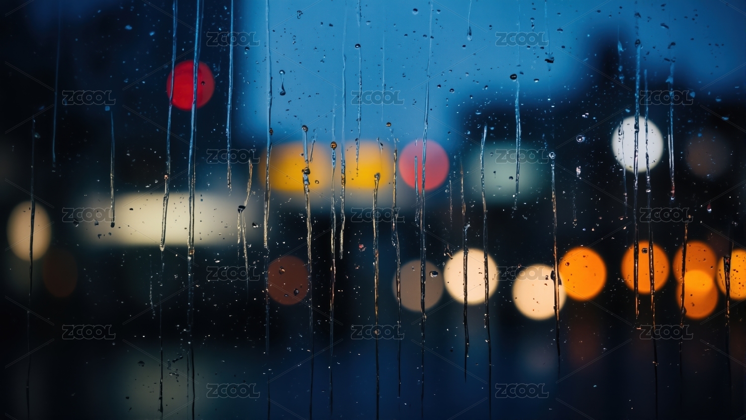 玻璃上的雨滴和散景灯光
