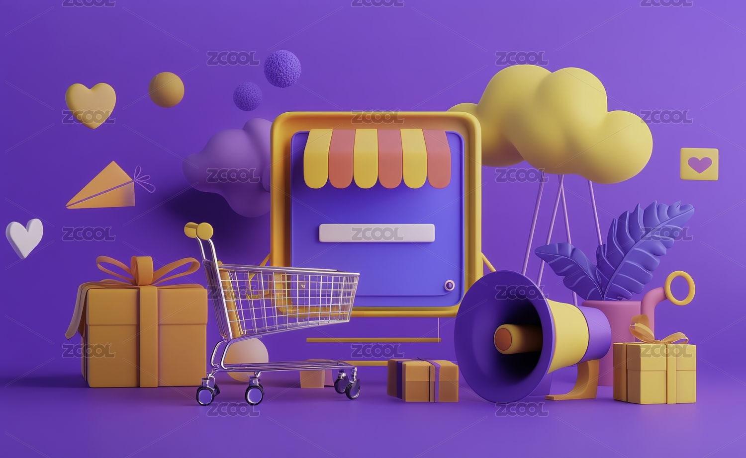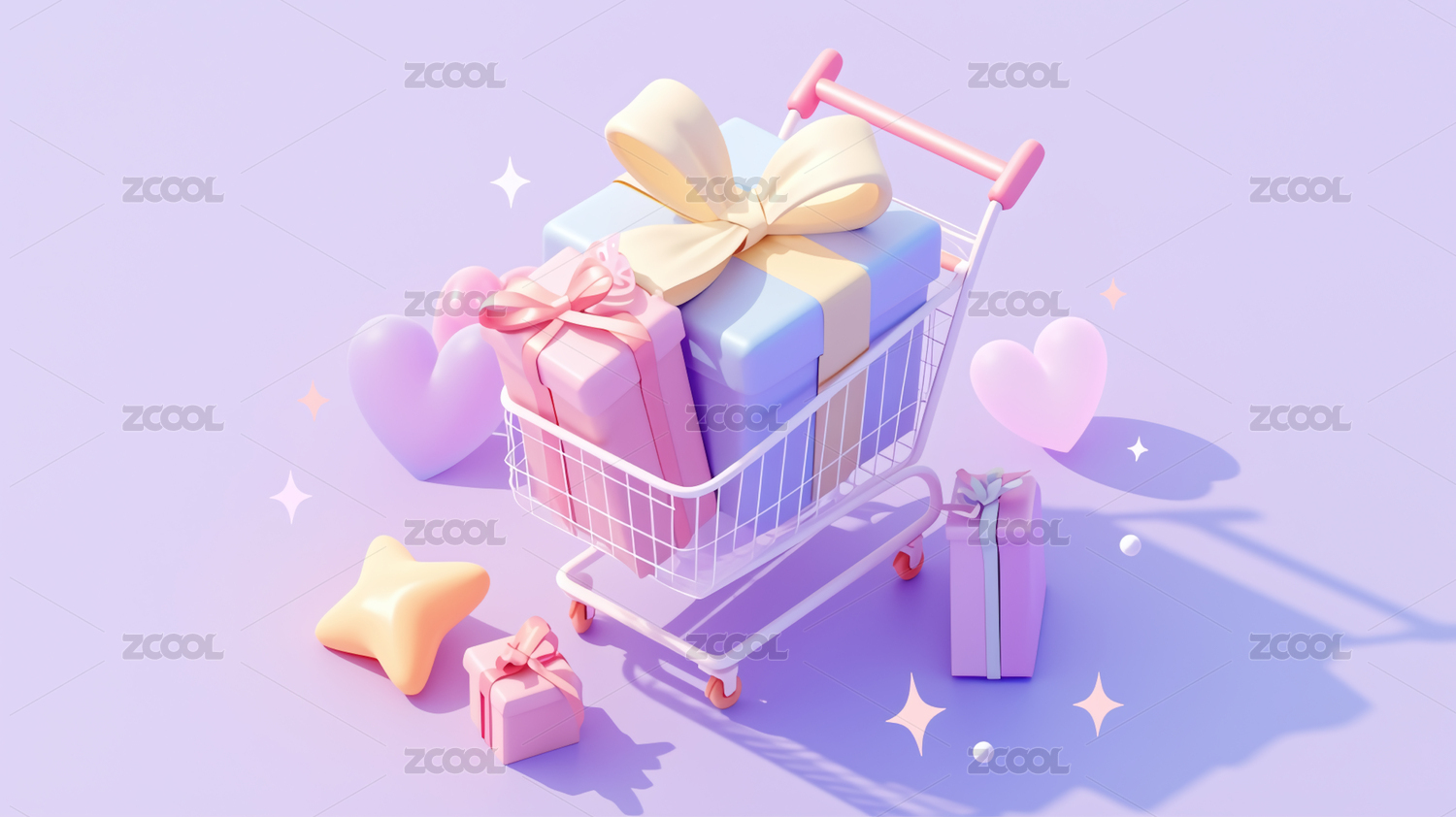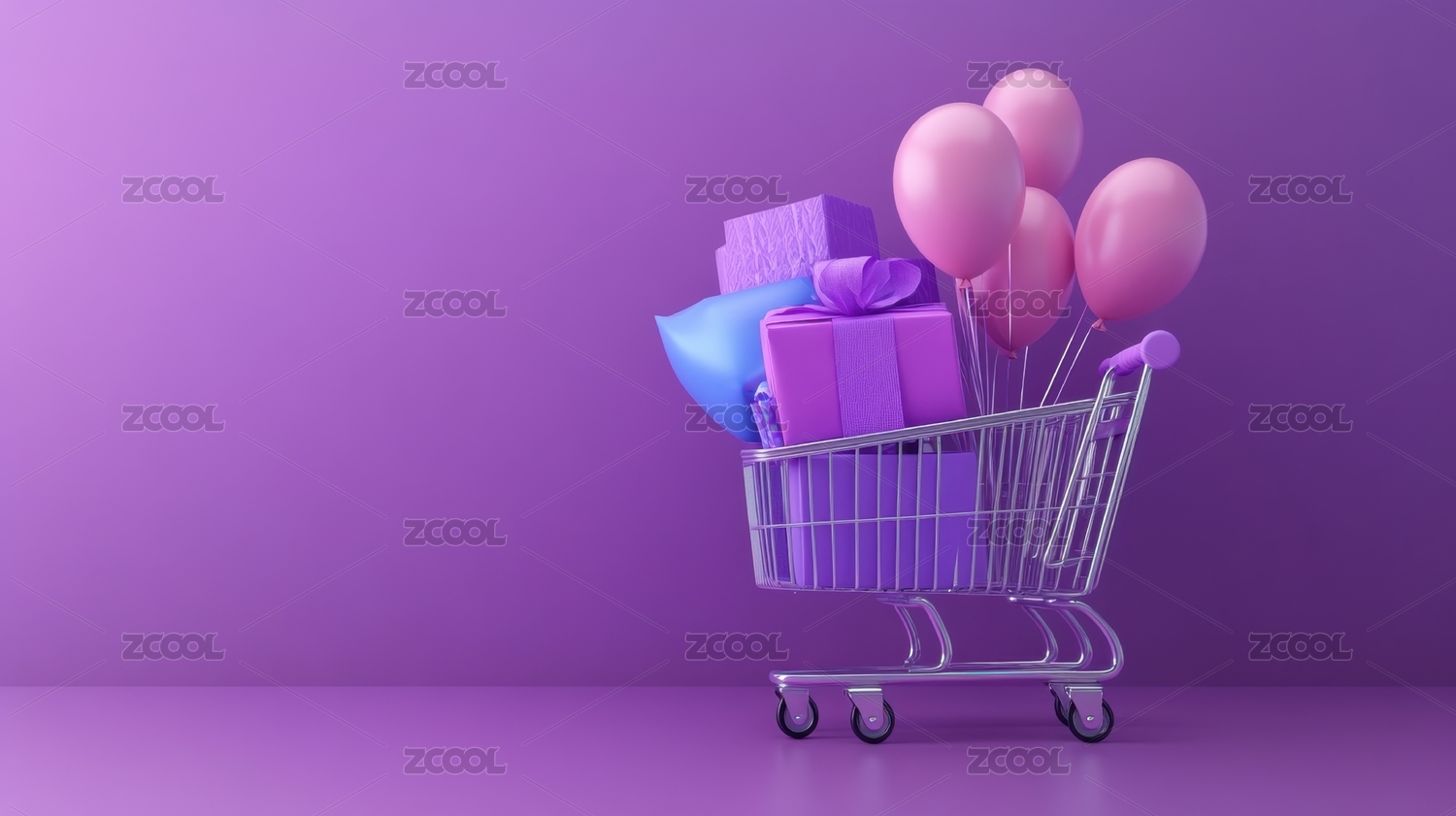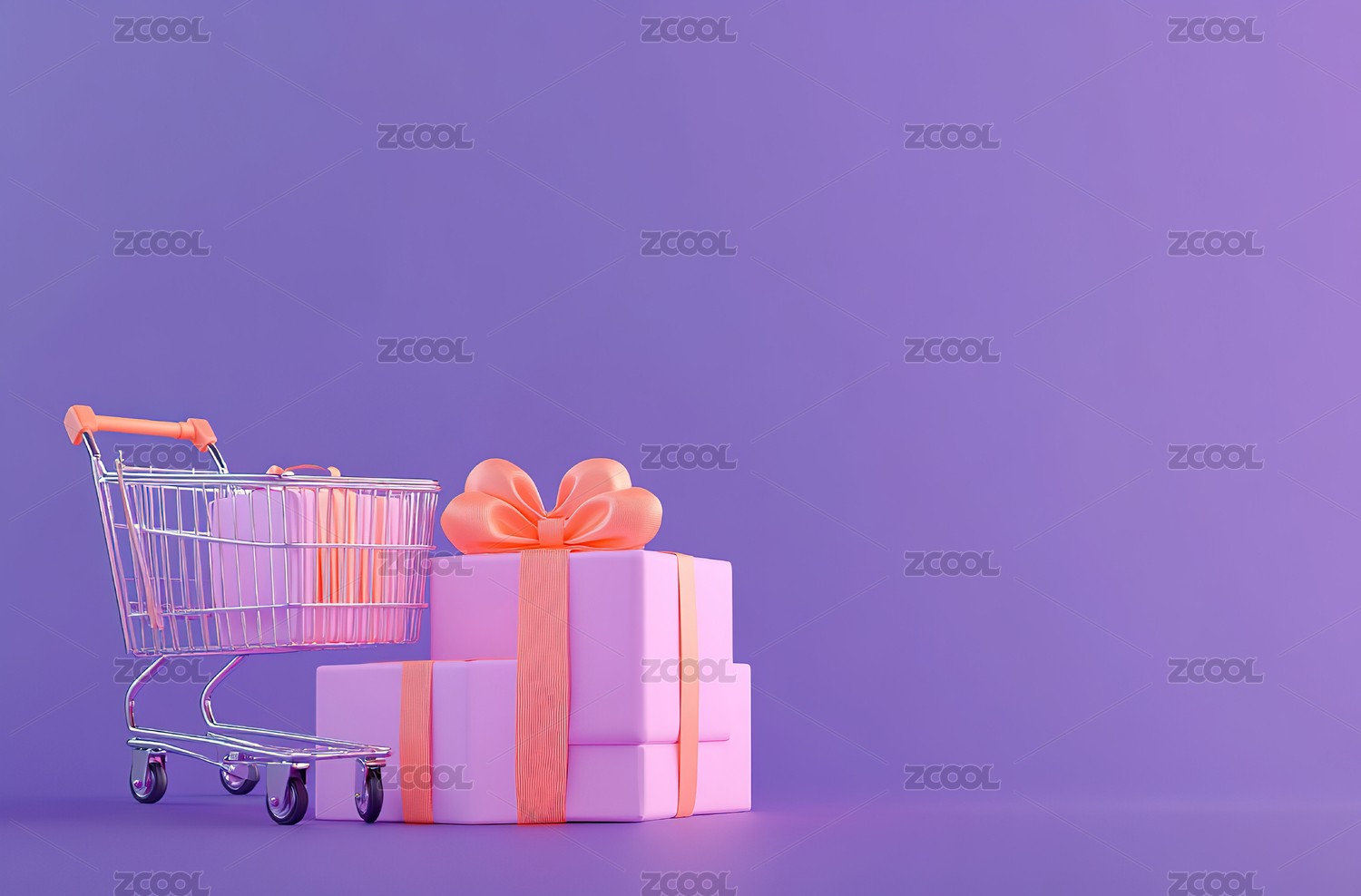 购物车,礼品盒,礼物,3D,渲染,紫色,背景,台灯,购物,植物