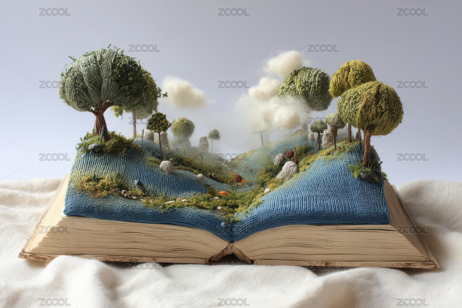 打开的书本中长出奇幻树木云朵景观