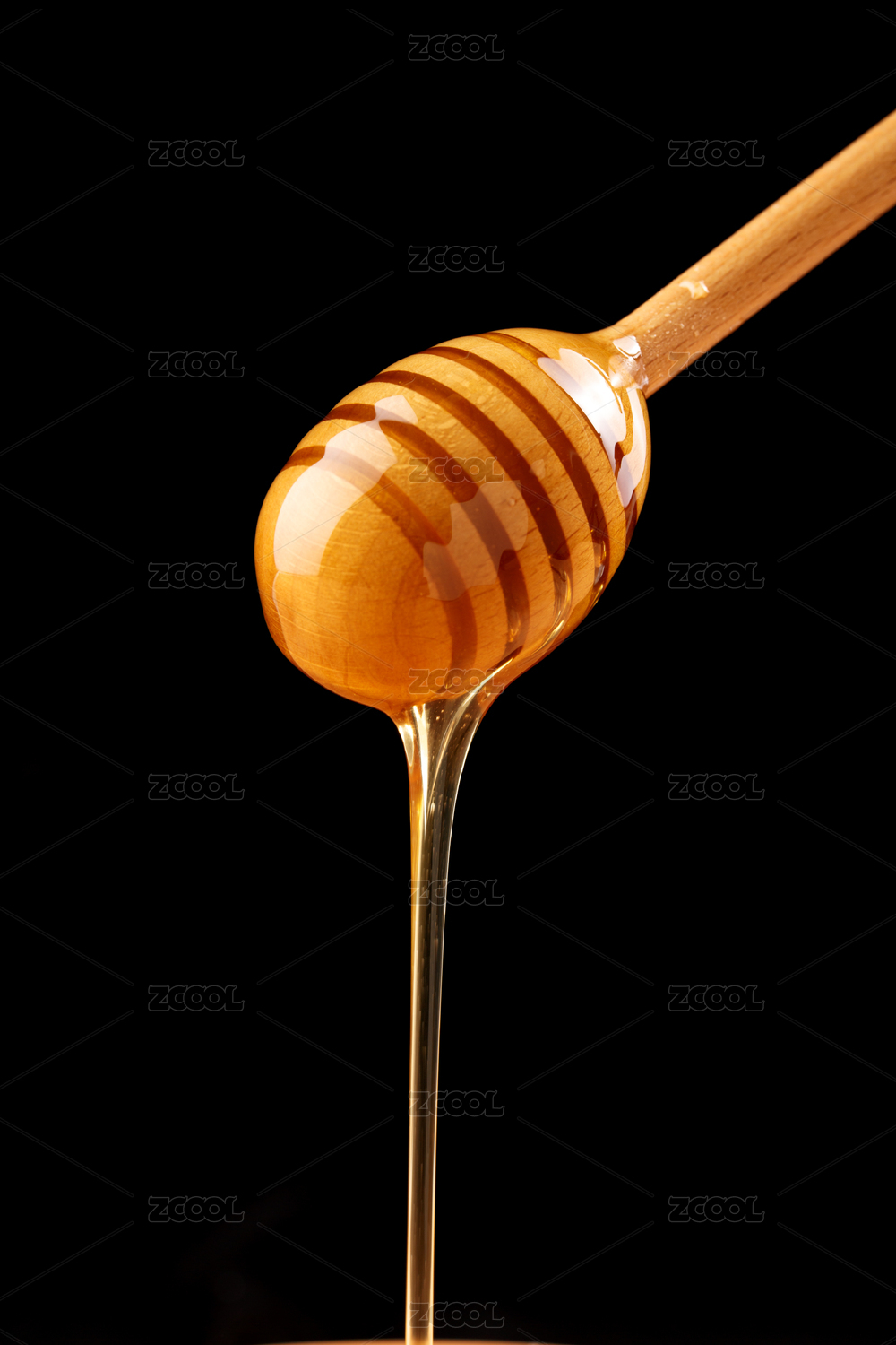 黑色背景下蜂蜜搅拌棒上滴落的蜂蜜特写