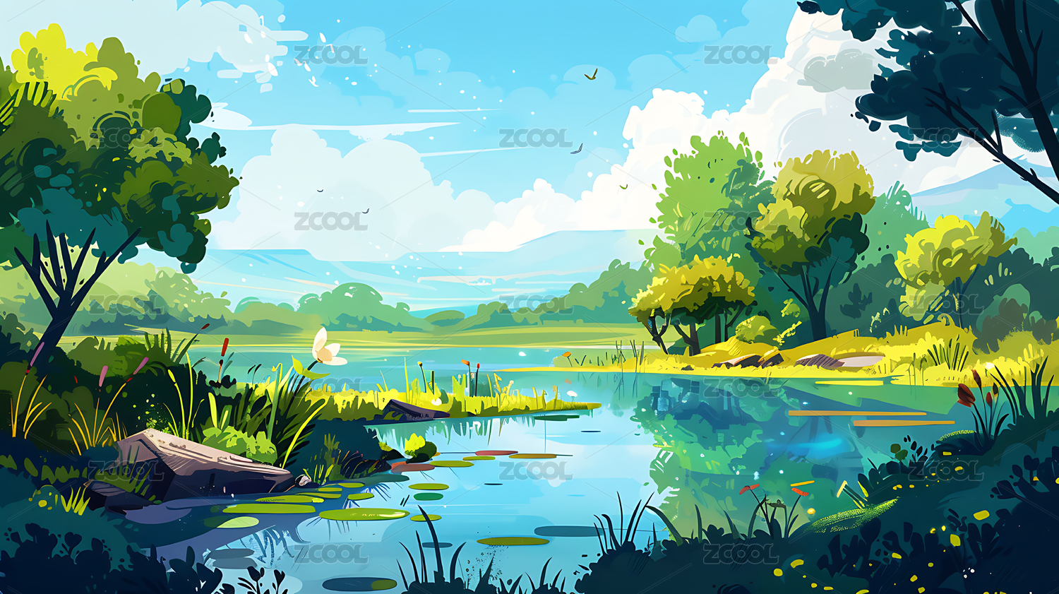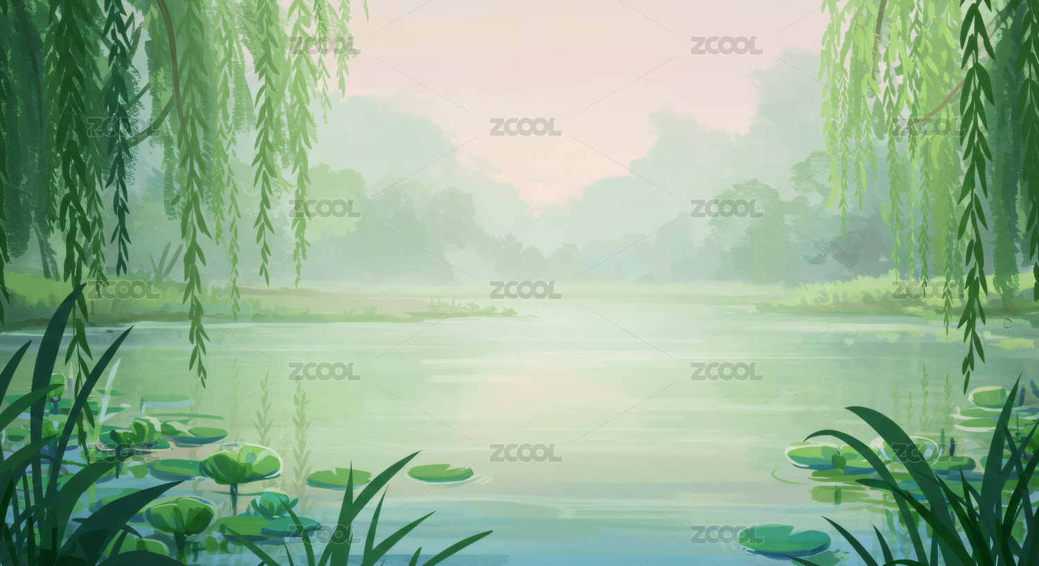 夏季池塘柳树插画
