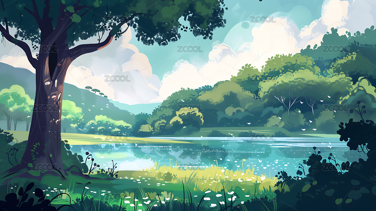 湖水,柳树,风景,插画,绿荫,植物,自然,叶子,垂柳,草丛