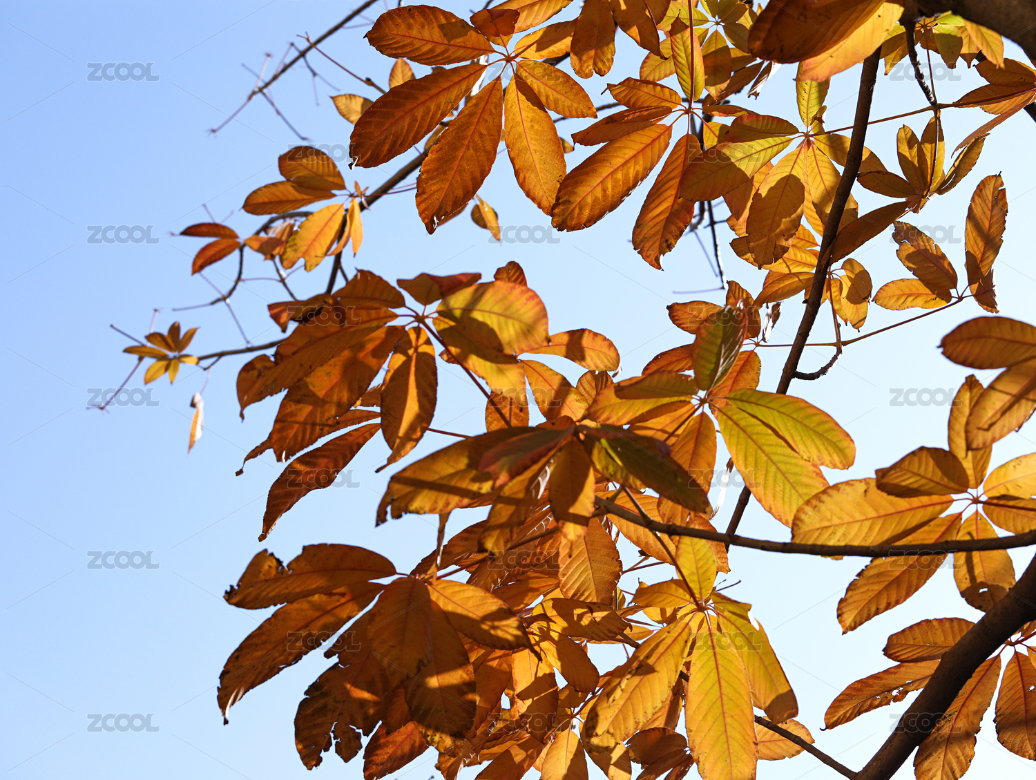阳光下蓝色水背景秋天红色叶子枝条特写