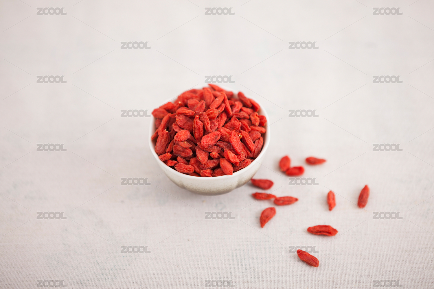 一碟红色的枸杞放在白色桌面上